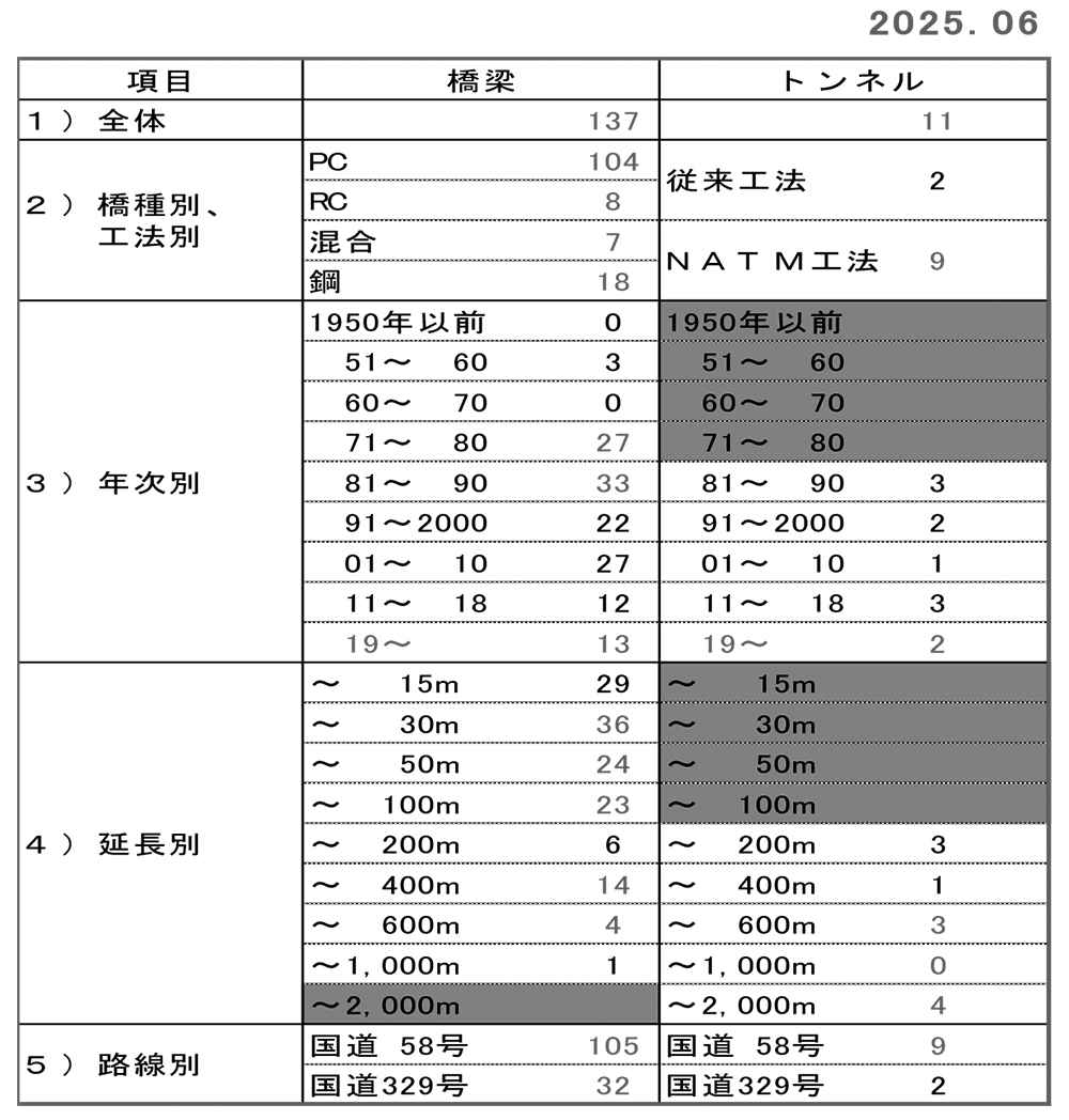 屋我 橋梁は137橋、その内20m以上は84橋、トンネルは11箇所を管理しています。