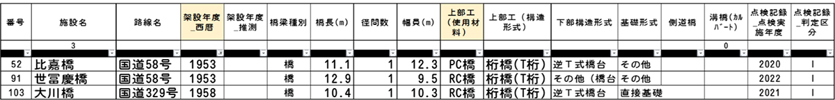 屋我 管内のⅢ判定は3橋です。大川橋側道橋(下り)、溝橋9、屋嘉橋が該当します。