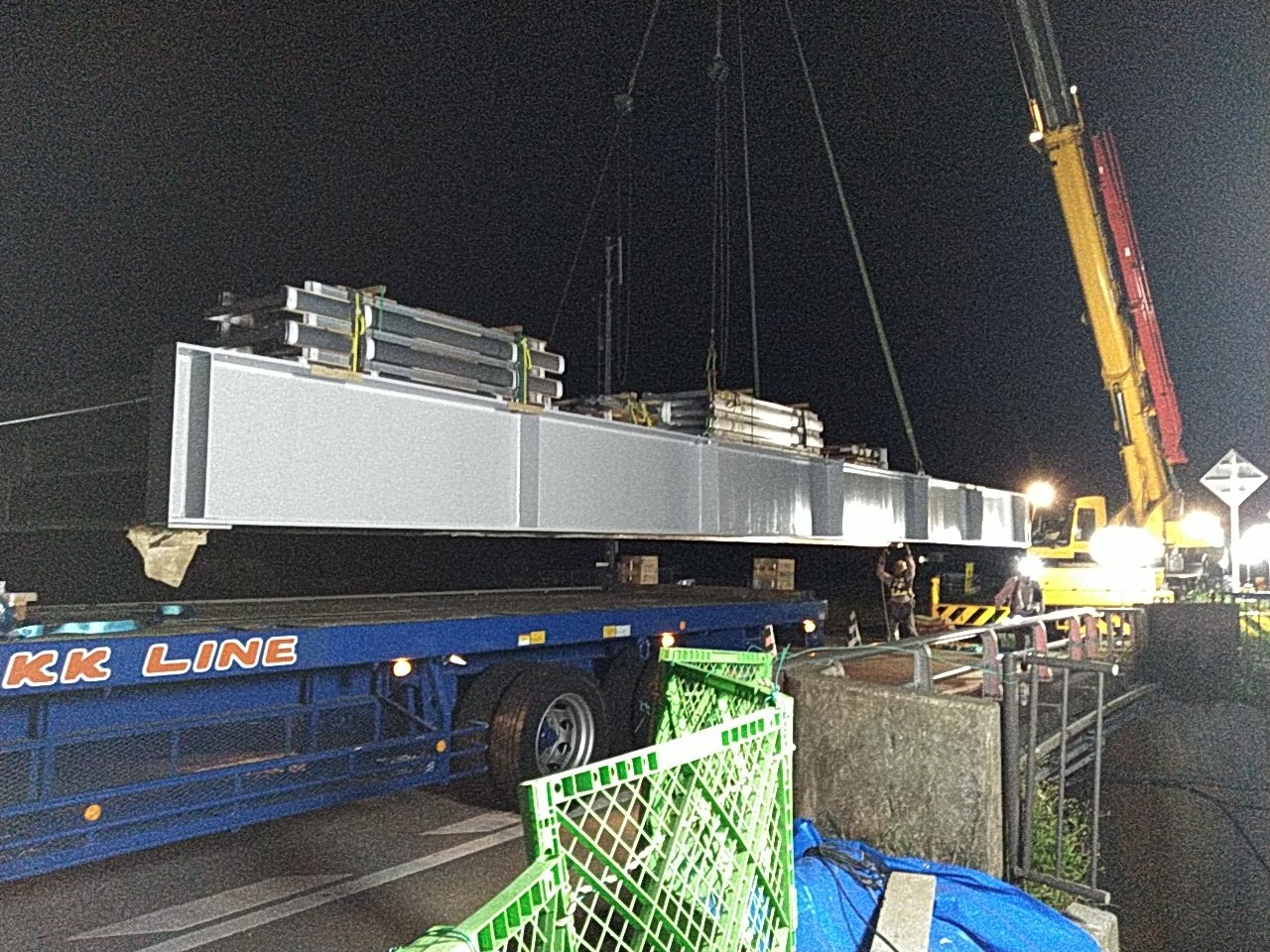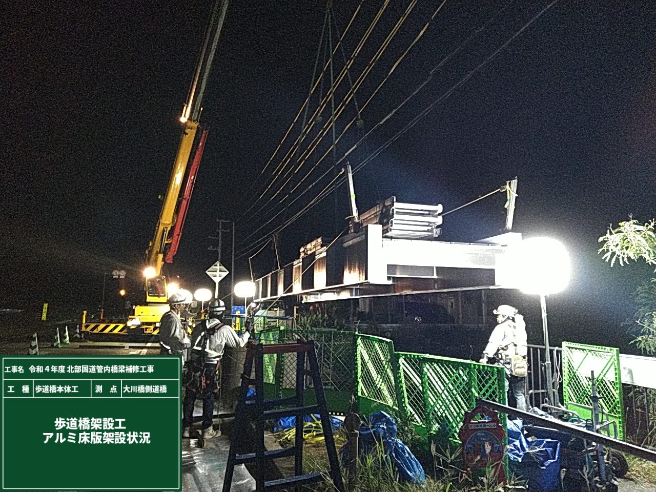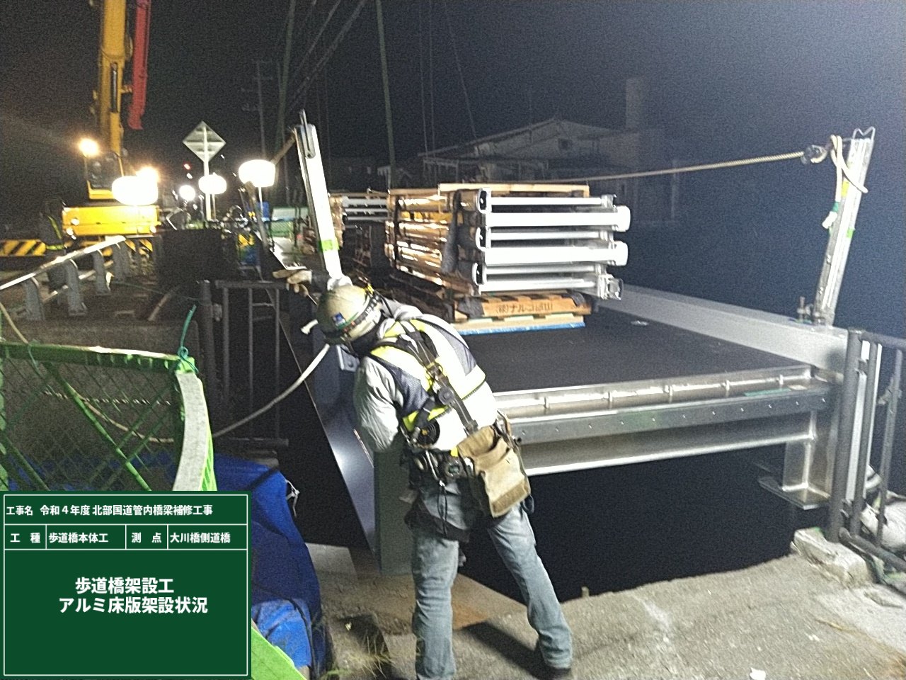 大川橋側道橋のアルミ合金単純鈑桁橋への架設状況