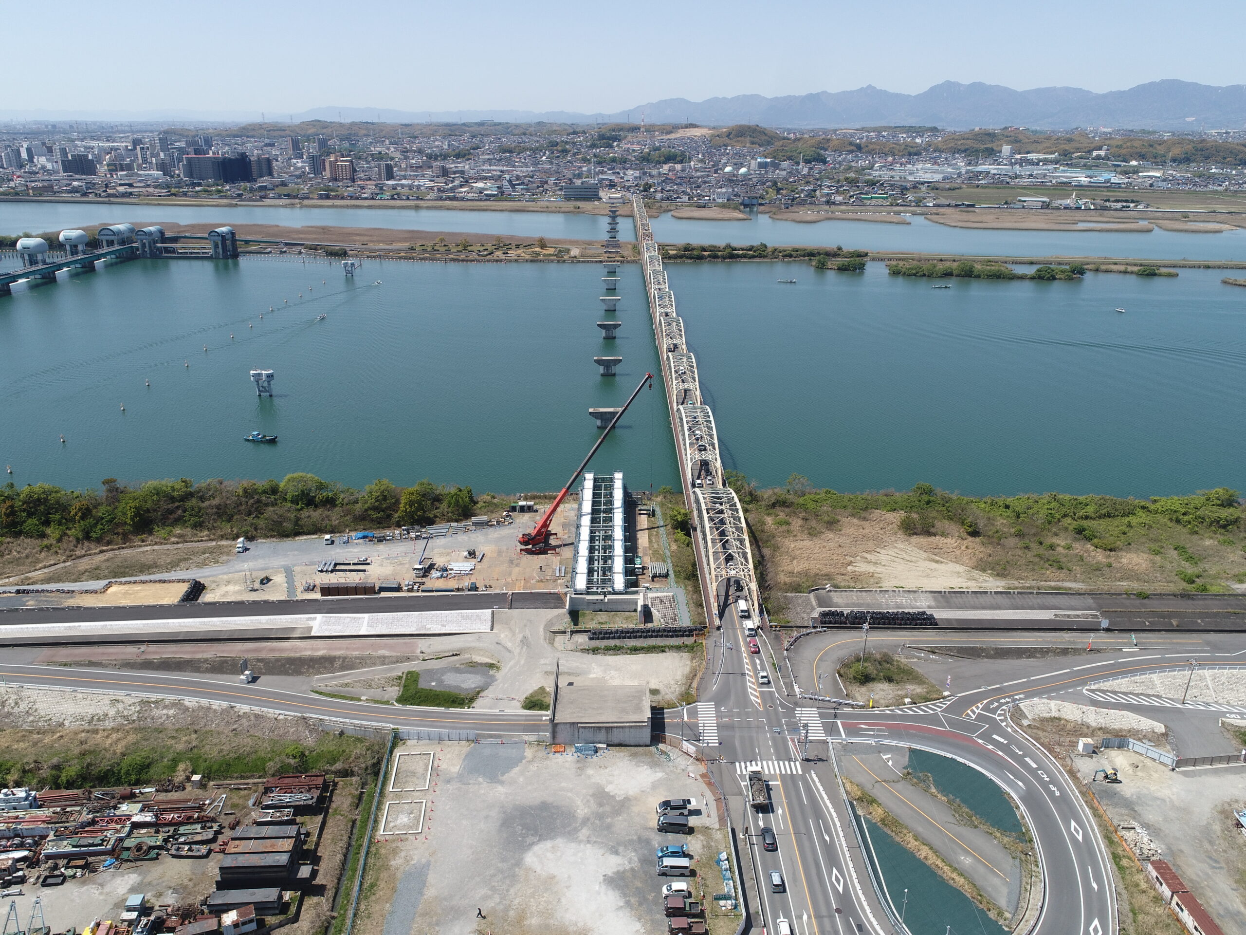 国道1号伊勢大橋は約90年が経過し、雨水や塩害の影響による劣化と共に老朽化が進んでおり、新橋への掛け替えによって、災害に強い道路機能の確保につながります。現在、上部工工事の架設に向けた準備をしているところです。