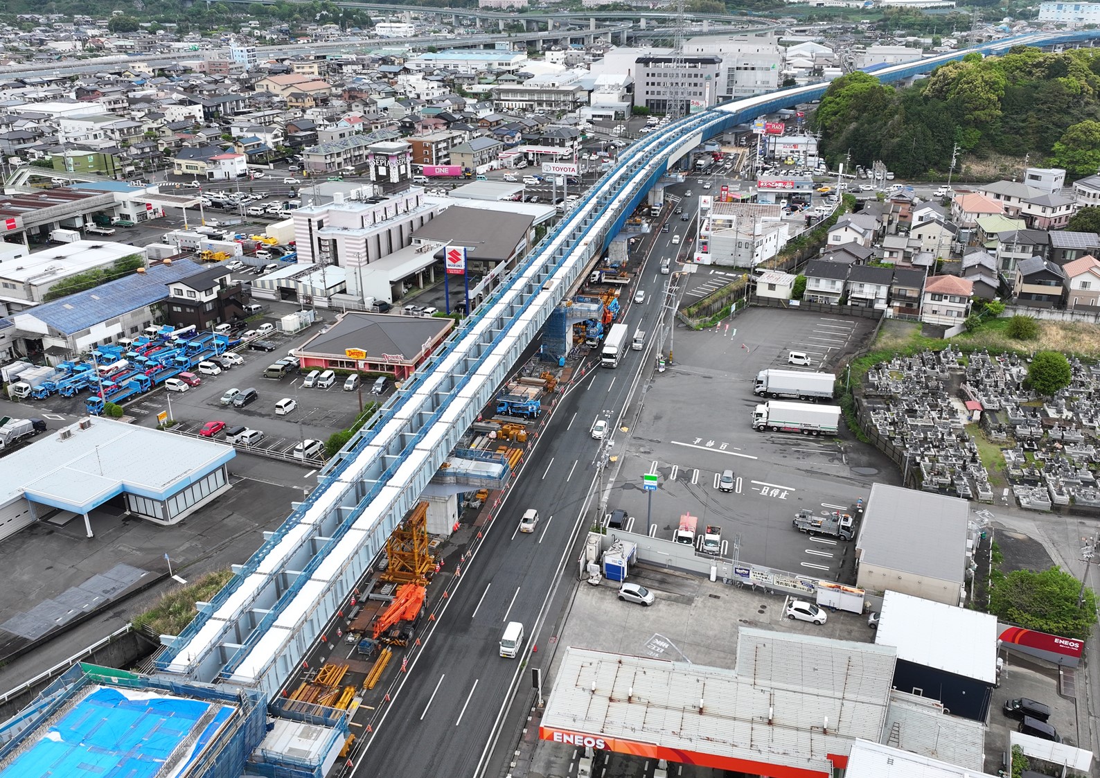 国道1号清水立体は、国道1号静清バイパスの2.4kmを高架構造にする事業であり、現在は上部工架設を進めているところです。