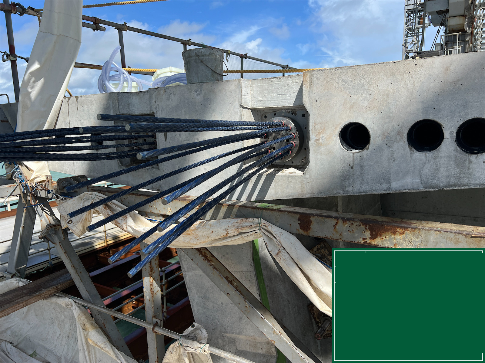PC橋や下部工の防食については、エポキシ樹脂塗装鉄筋やエポキシ樹脂被覆PC鋼材の採用、コンクリートの緻密化、ASR抑制、打設時のワーカビリティ―の向上を期待して、Jパワーの石川火力発電所で産出されたフライアッシュを用いたコンクリートを採用しています。また、PC箱桁の下床版部については、ひび割れ抑制対策として、炭素繊維ケーブル補強筋を採用しました。