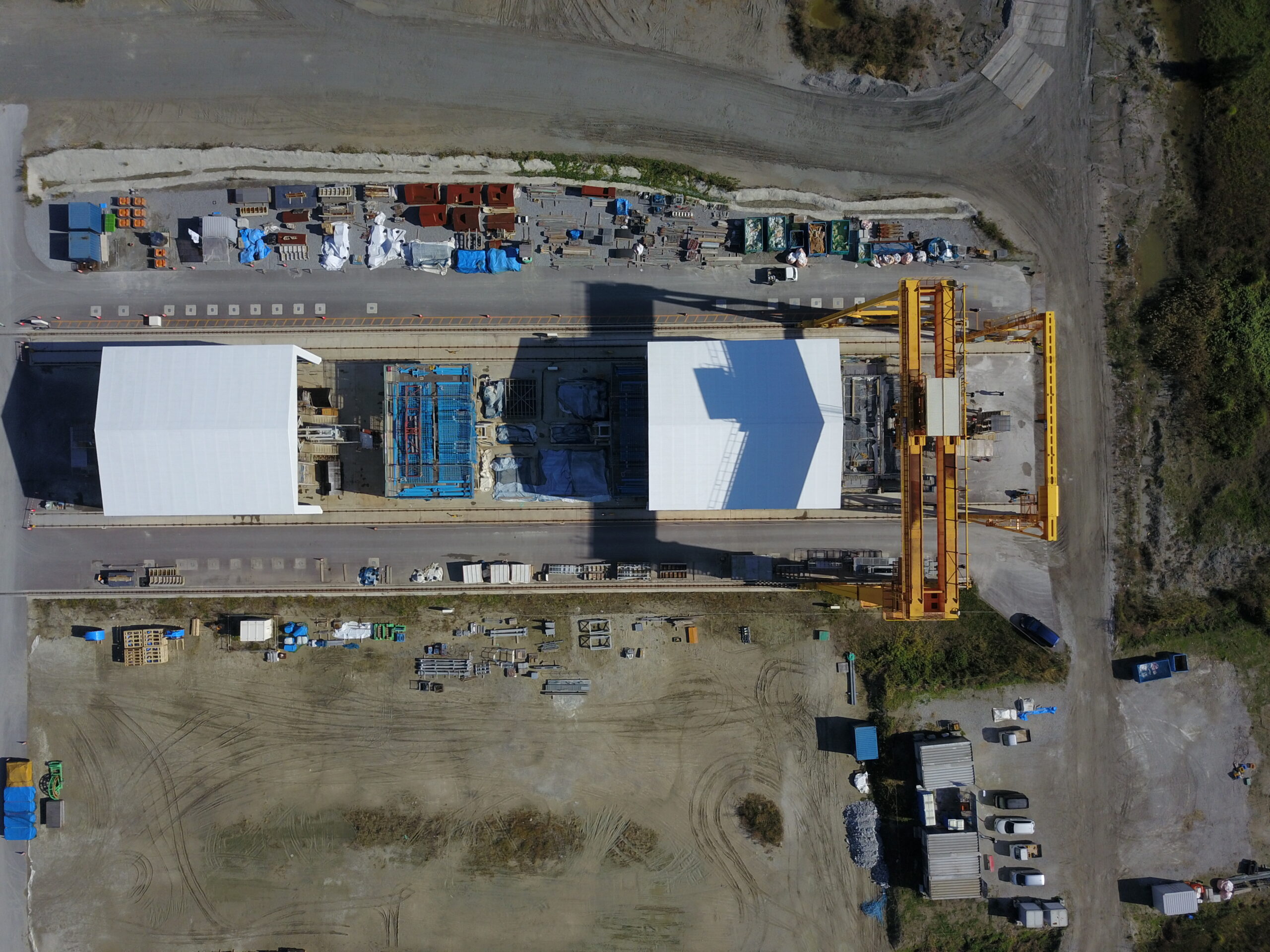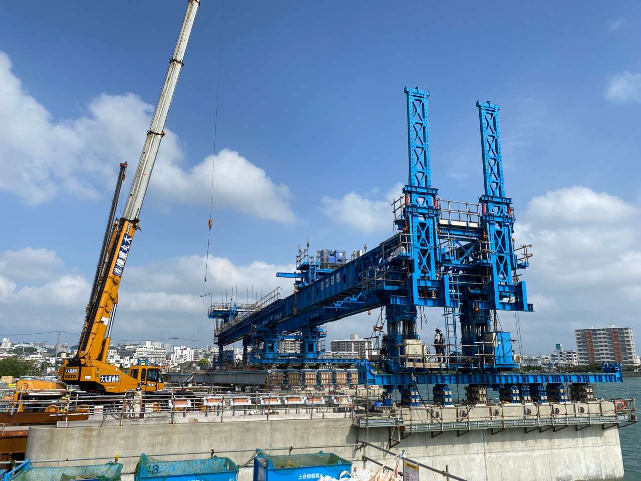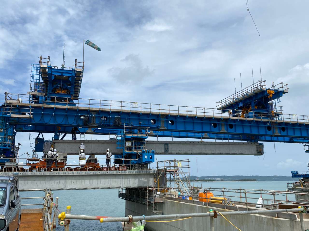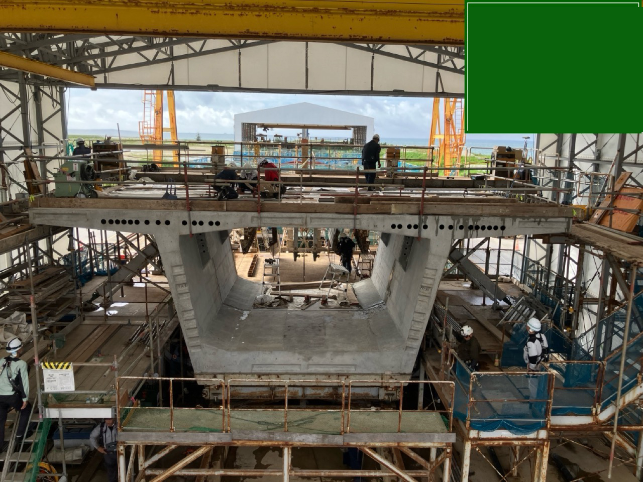 例えば、県道20号線(泡瀬工区)アクセス橋梁では、セグメント桁製作設備において、人工島内に2基の桁製作設備を設けて、すでに製作されたセグメントの桁の妻部を型枠として新セグメント桁を1ブロックずつ製作するショートラインマッチキャスト工法を採用しています。
