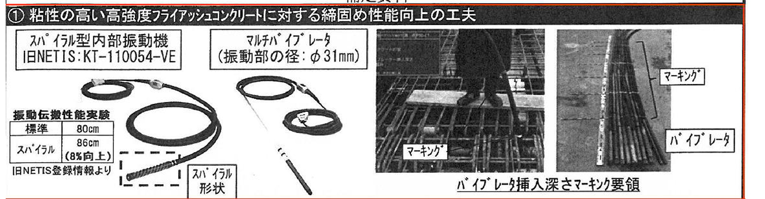 粘度の高い高強度フライアッシュコンクリートを締め固めるために、特殊なバイブレーター(スパイラル型内部振動機)を採用