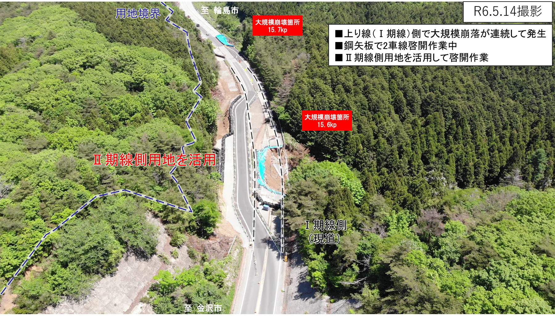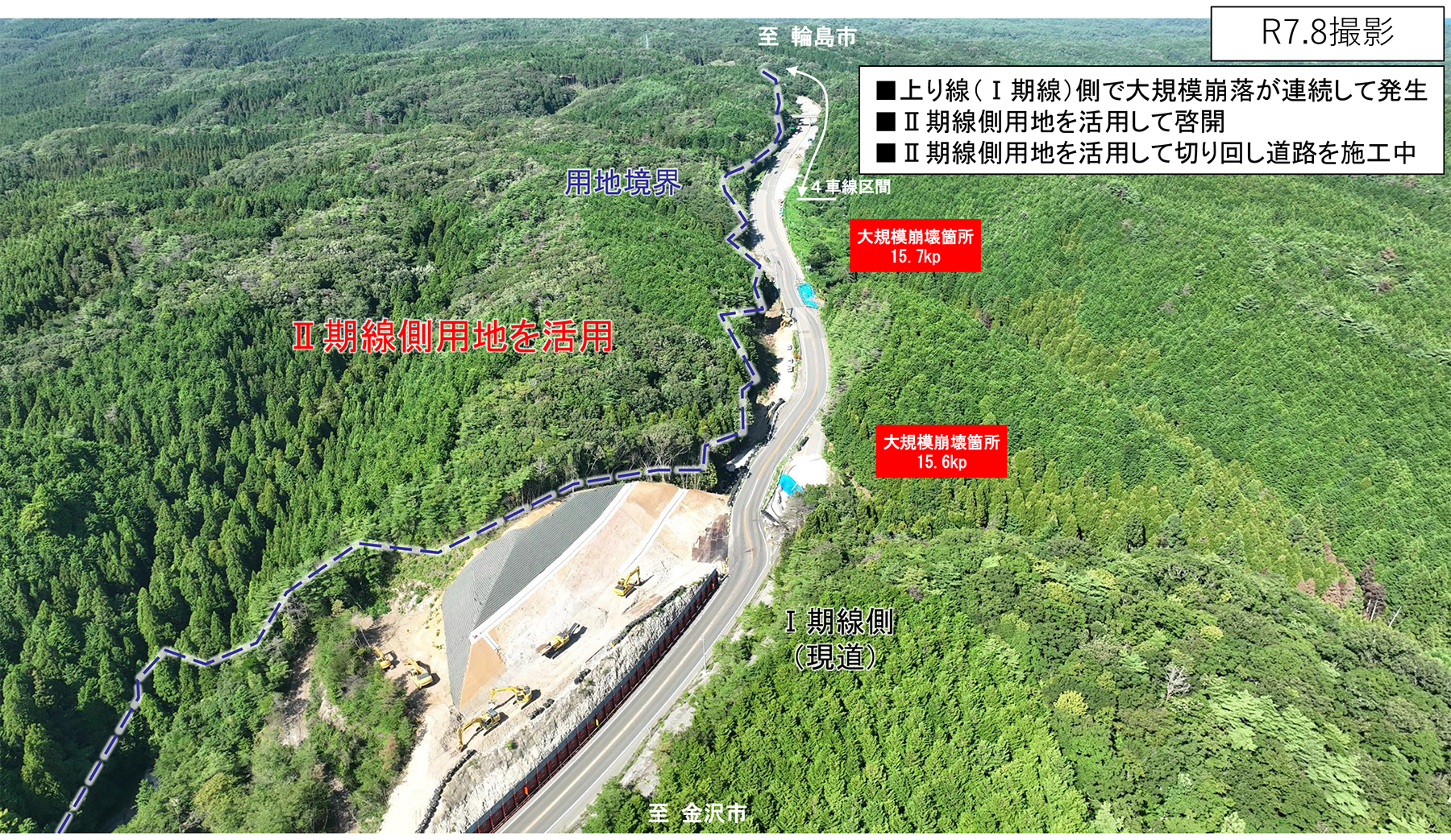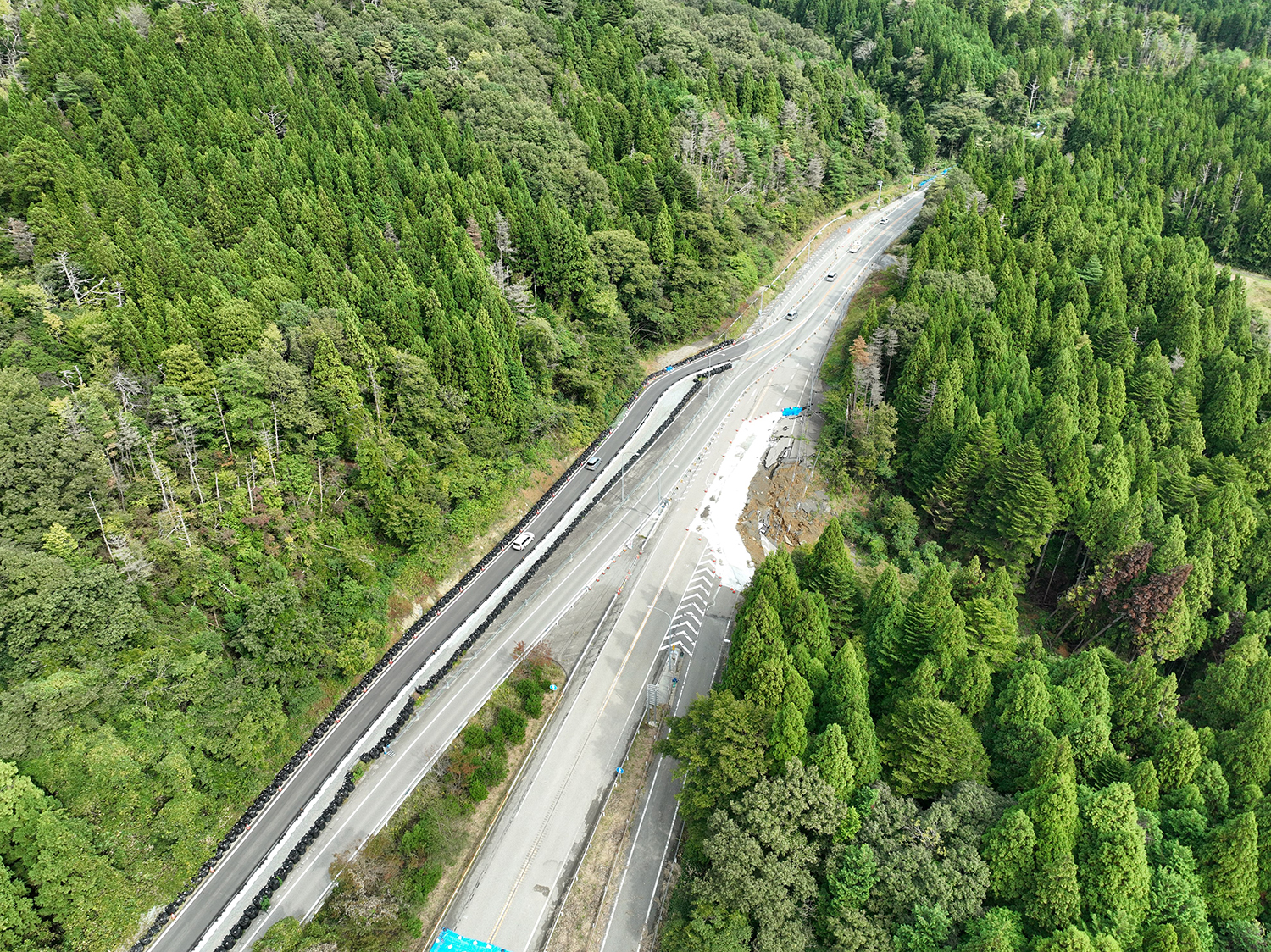 本復旧においては、2期線側に振った線形を1期線の方に戻すパターンと、2期線側に逃がしたままにするパターンが出てきます。2期線に振った平面線形で道路としての安全性、供用性が確保できれば、1期線にわざわざ戻す必要はないわけです。また、4車線化が完了している区間では、残存した部分も盛土構造として脆弱な箇所はしっかり強固にして再度構築することで、構造としての安全性を確保しようと考えています。