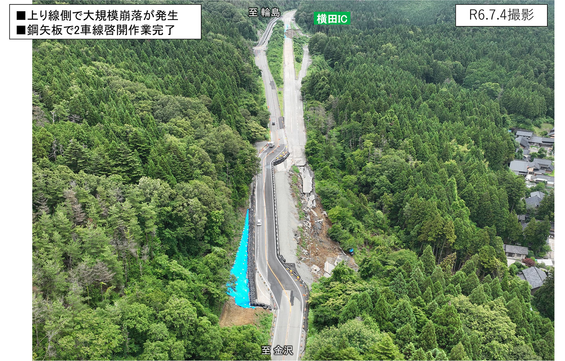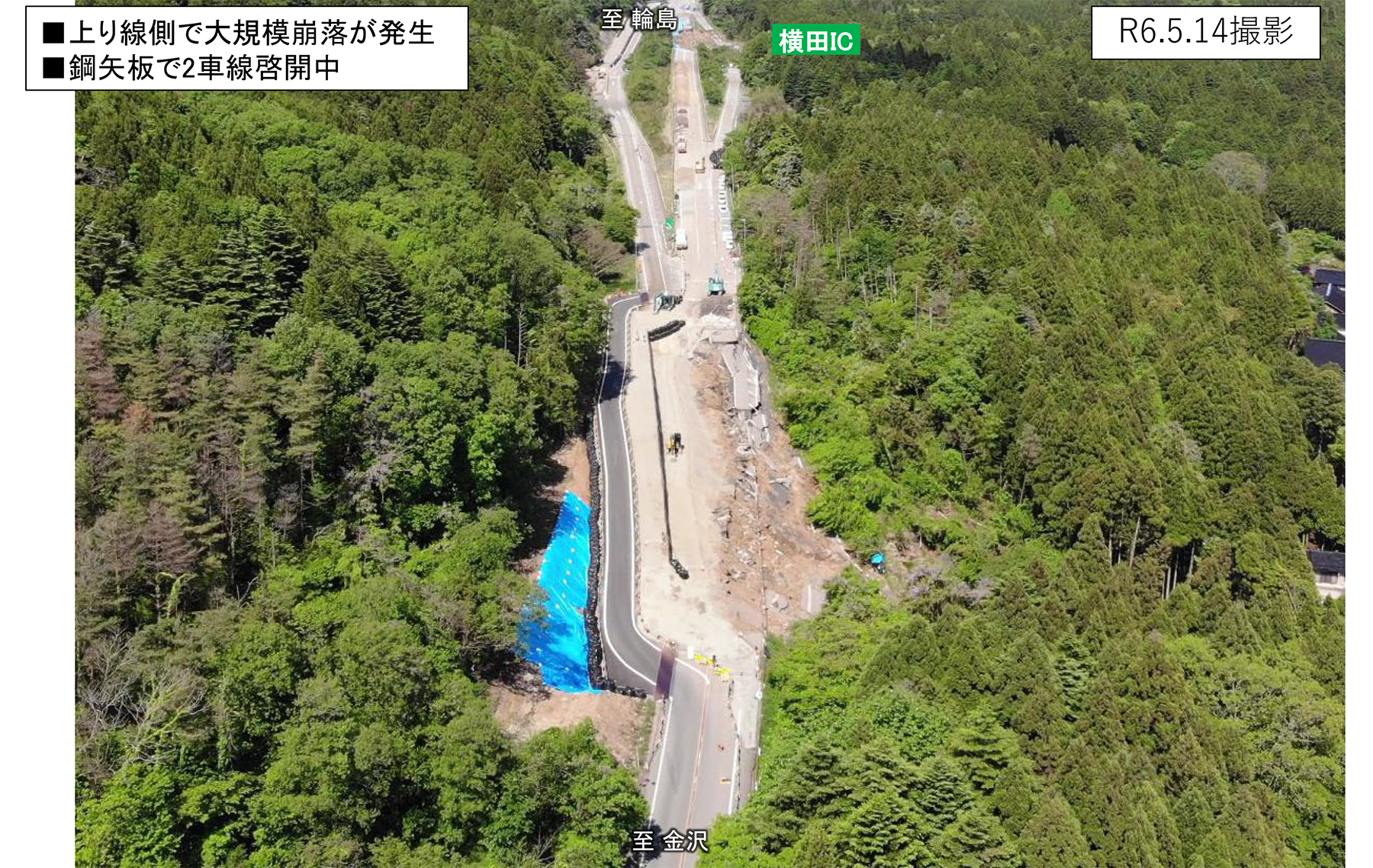 2024年1月1日に被災して、1月18日には、災害協定に基づき日本建設業連合会の協力を頂き、輪島道路の区間(のと三井IC~のと里山空港IC)を片側1車線で暫定的に復旧供用させました。それから順次、被災の状況に応じて、通行できる区間を伸ばしていきました。県からの権限代行は1月23日から始まったのですが、この時には、のと里山海道の一部を国の方で啓開していくこととなり、県と国でのと里山海道を啓開していきました。徳田大津IC以北について、3月15日には北向きの一方通行で通れるようにし、さらに、一部を除く対面通行を確保したのは7月17日のことでした。その「一部」に該当するのが能登大橋付近でした。能登大橋の南側のA1橋台背面の盛土が大きく沈下しており、同箇所を応急復旧して、全区間で対面通行可能となったのは、さらに2ヶ月後の9月10日のことでした。