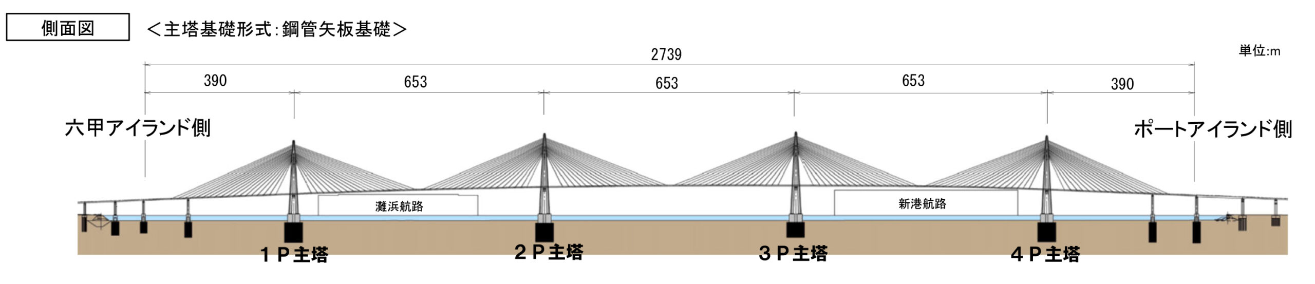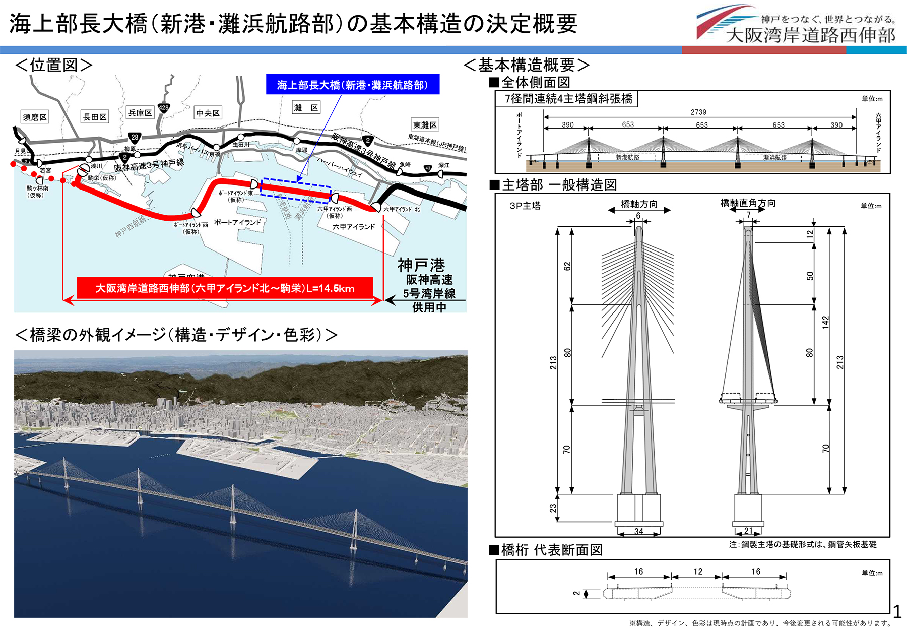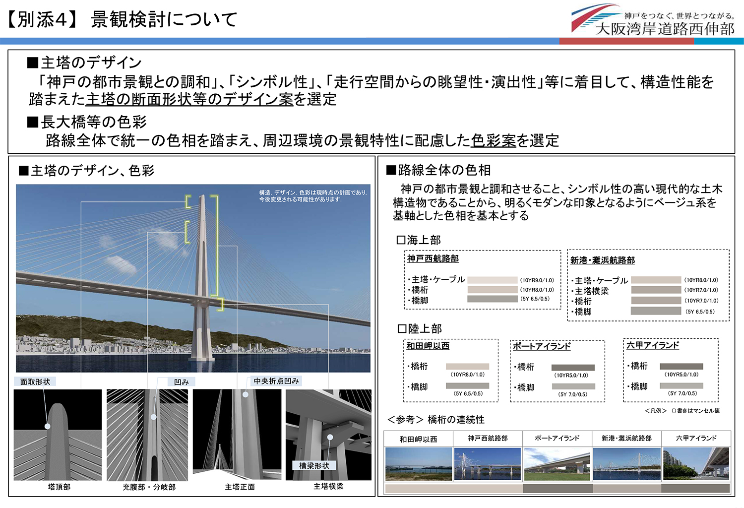 海上長大橋の新港・灘浜航路を跨ぐ橋梁につきましては、令和5年8月に基本構造を決定しております。一番目立つのは主塔部のデザインですが、神戸の都市景観との調和、シンボル性、走行空間からの眺望性や演出性などに着目し、構造性能を踏まえた主塔の断面形状などのデザイン案を選定しました。