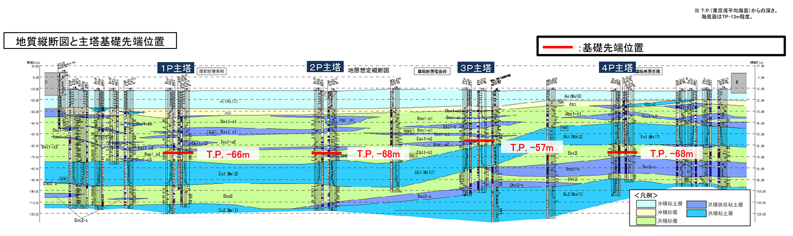 その結果、1P主塔部では-66m、2P主塔は-68m、3P主塔は-57m、4P主塔は-68mの深さに達します。基礎は鋼管矢板井筒基礎を予定しており、杭の長さは60~70mを超える規模に達すると考えています。さらに主塔基礎の寸法は最大の2Pで橋軸50m×橋軸直角47mとなっています。