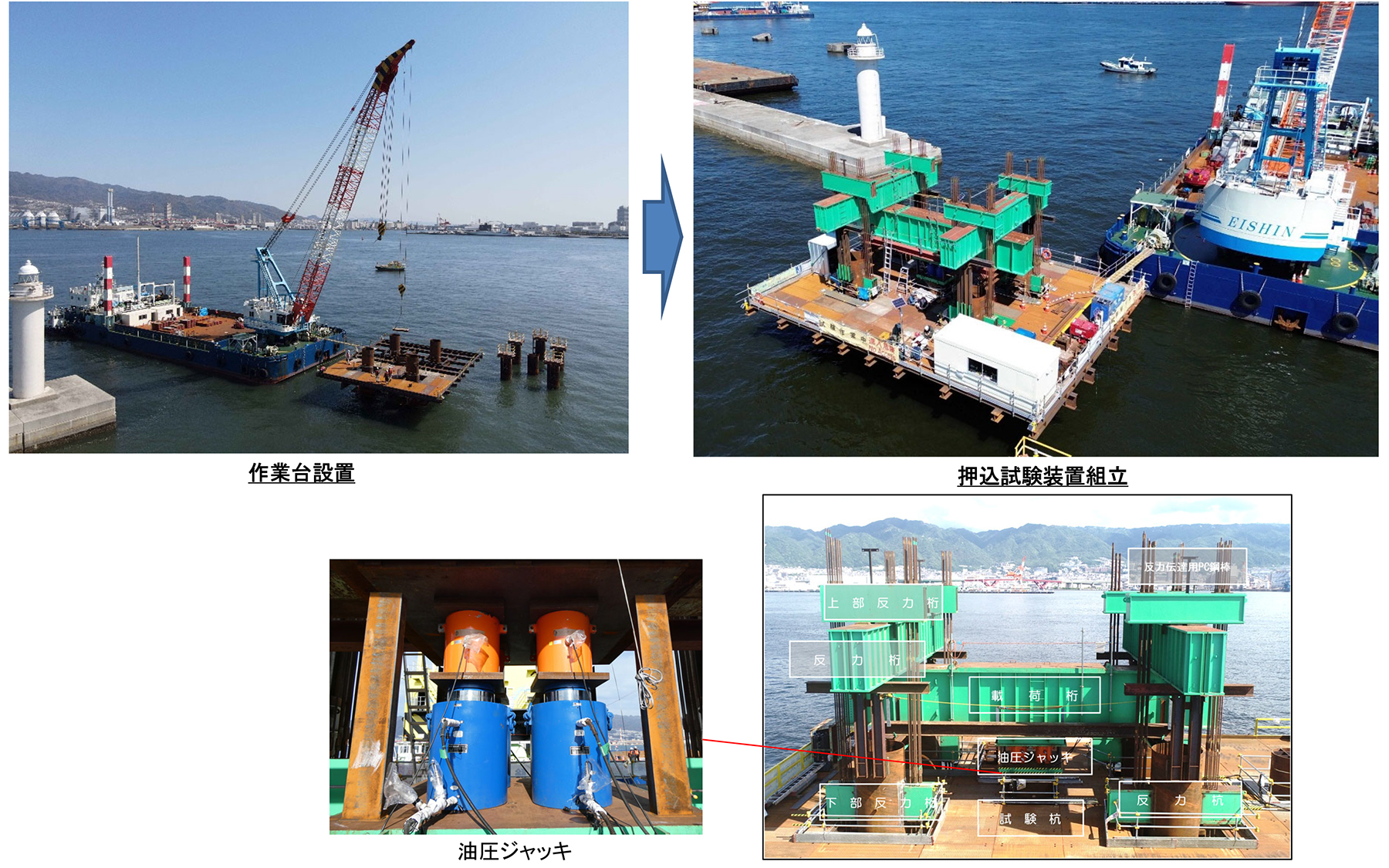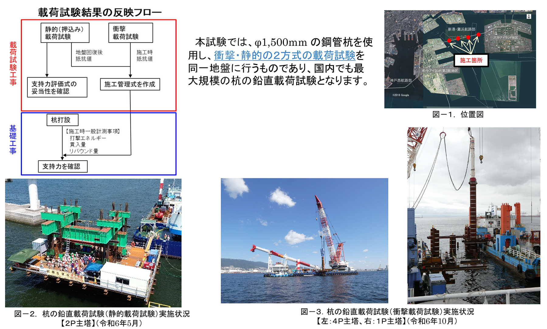 設計にあたっては普段とはけた違いの地盤調査を事務所で実施しております。各主塔基礎予定地で10本以上のボーリングと、合わせて、現地での実際の支持力を確認するために杭の鉛直載荷試験として、衝撃載荷試験を行った上で、最後に押し込み載荷試験と2つの試験を行い、実際に現地に杭を打って、支持力を測定しています。