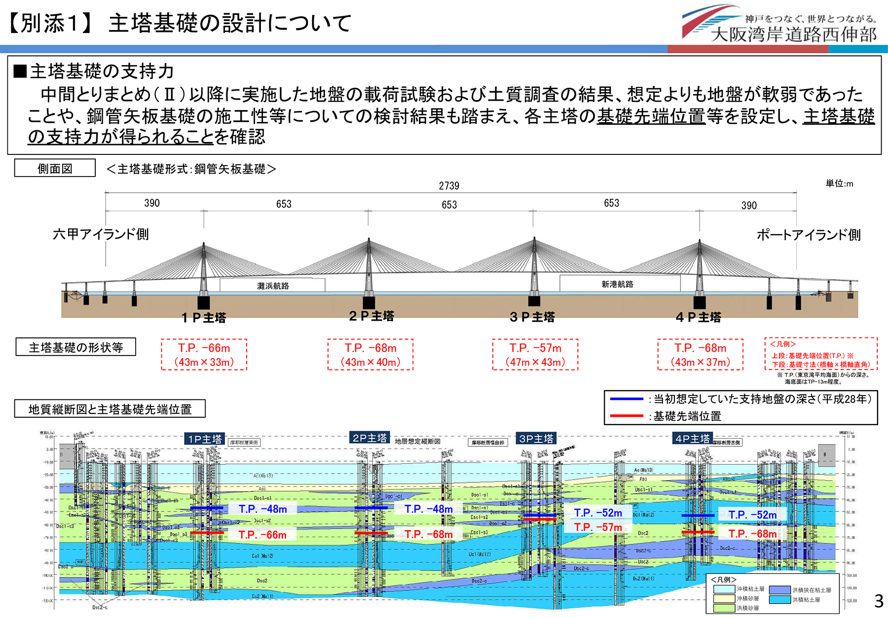 ――斜張橋の基礎についてお聞きします。斜張橋は摩耶断層や和田岬断層を跨ぐ位置に計画されている橋梁で、その断層を避けた位置に主塔基礎を持っていくことはマストであり、設計にもそれは反映されていることは存じております。これに加えて基礎の撓曲変位や傾斜角をどのように考慮するかが、新港・灘浜航路部においても神戸西航路部においても重要になってくると思いますが、その辺はいかがですか