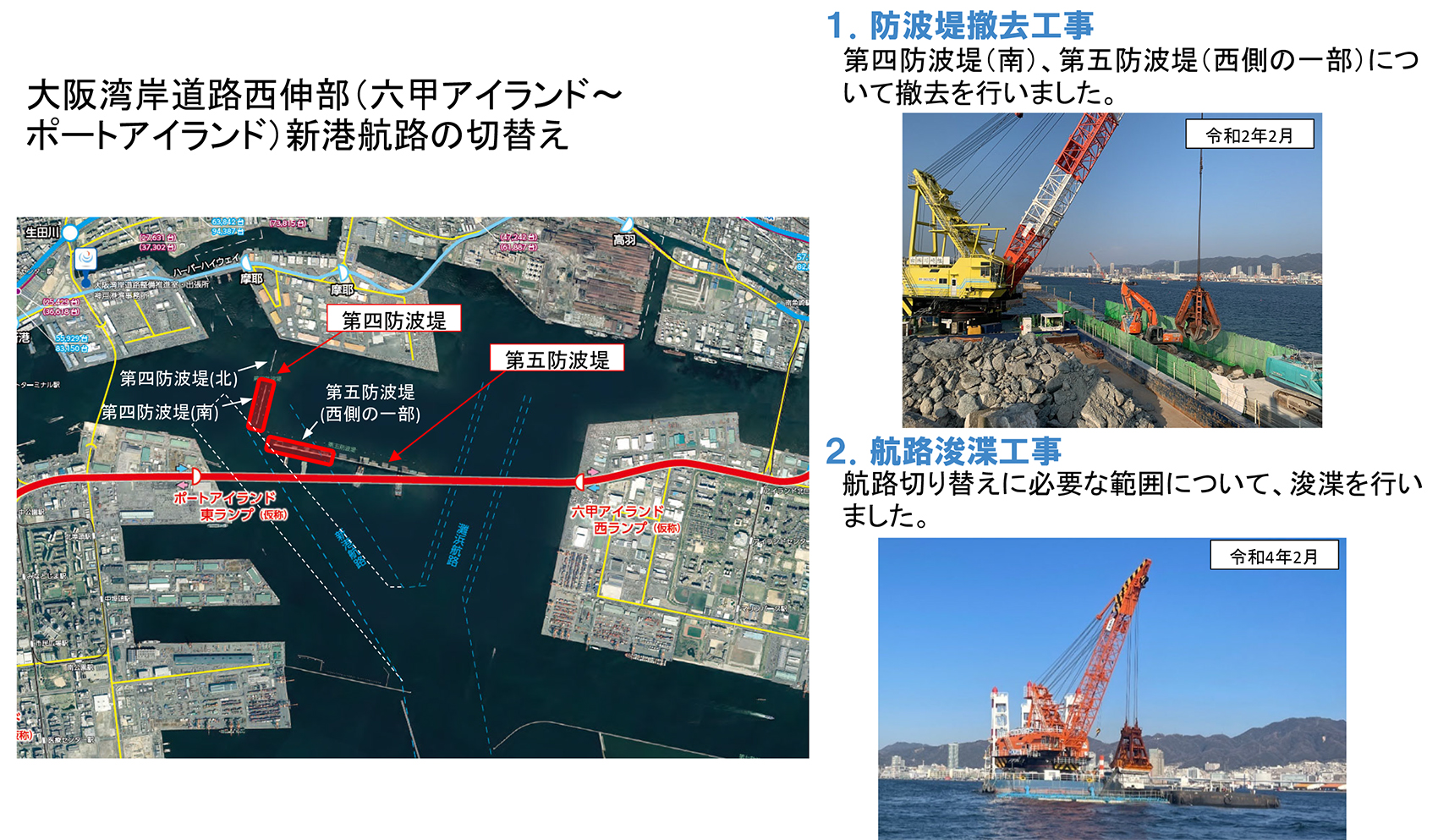 石原 もともと事業着手した時に、我々神戸港湾事務所がまず手を付けたのは航路の切り替えです。左図の白い点線が、旧航路でして、今回その旧航路の上に基礎が立ちますので航路の切り替えを行わなくてはいけません。赤いハッチングのかかった第4防波堤南と第5防波堤西側の一部を別途撤去して浚渫し、航路の切り替えを完了しています。