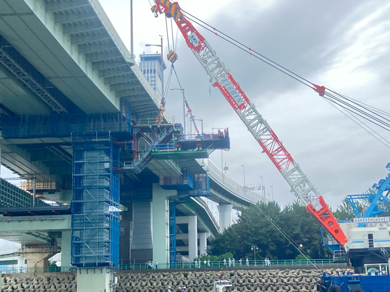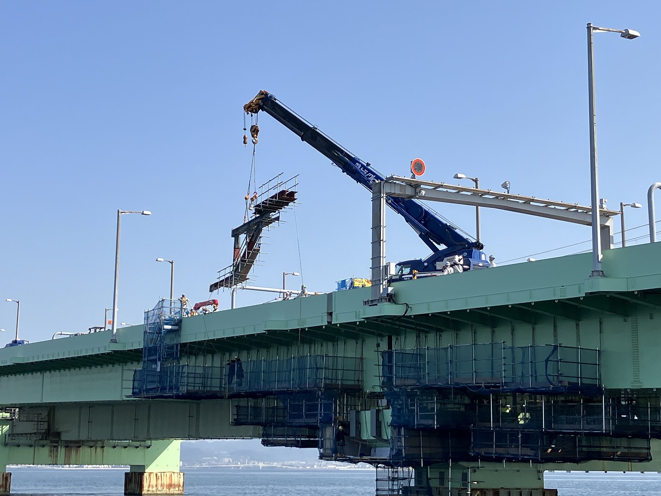井上 通常は斜材を取り替える際、まずは仮設斜材を取り付け、既設斜材を撤去し、新しい斜材を取り付けて、そちらに力を伝達した後、仮設斜材を撤去する手法をとります。しかし本現場では、解析などを綿密に行った結果、仮設斜材を取り付けずとも、既設斜材の撤去、新設斜材の設置ができることが分かり、提案して施工しました。これも弊社技術力の賜物であると考えています。
