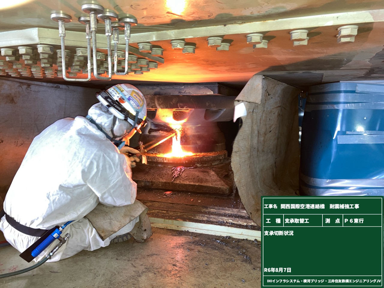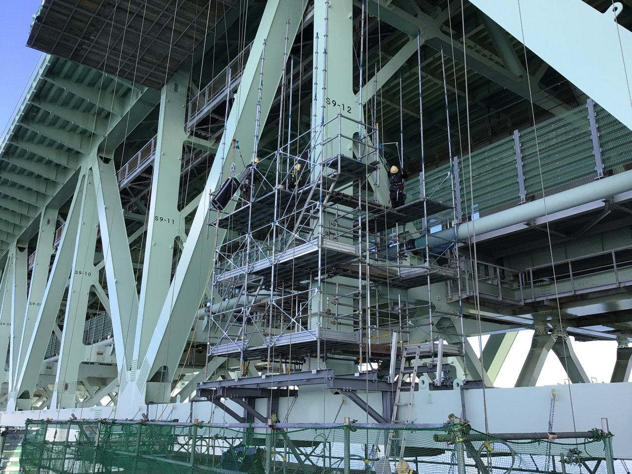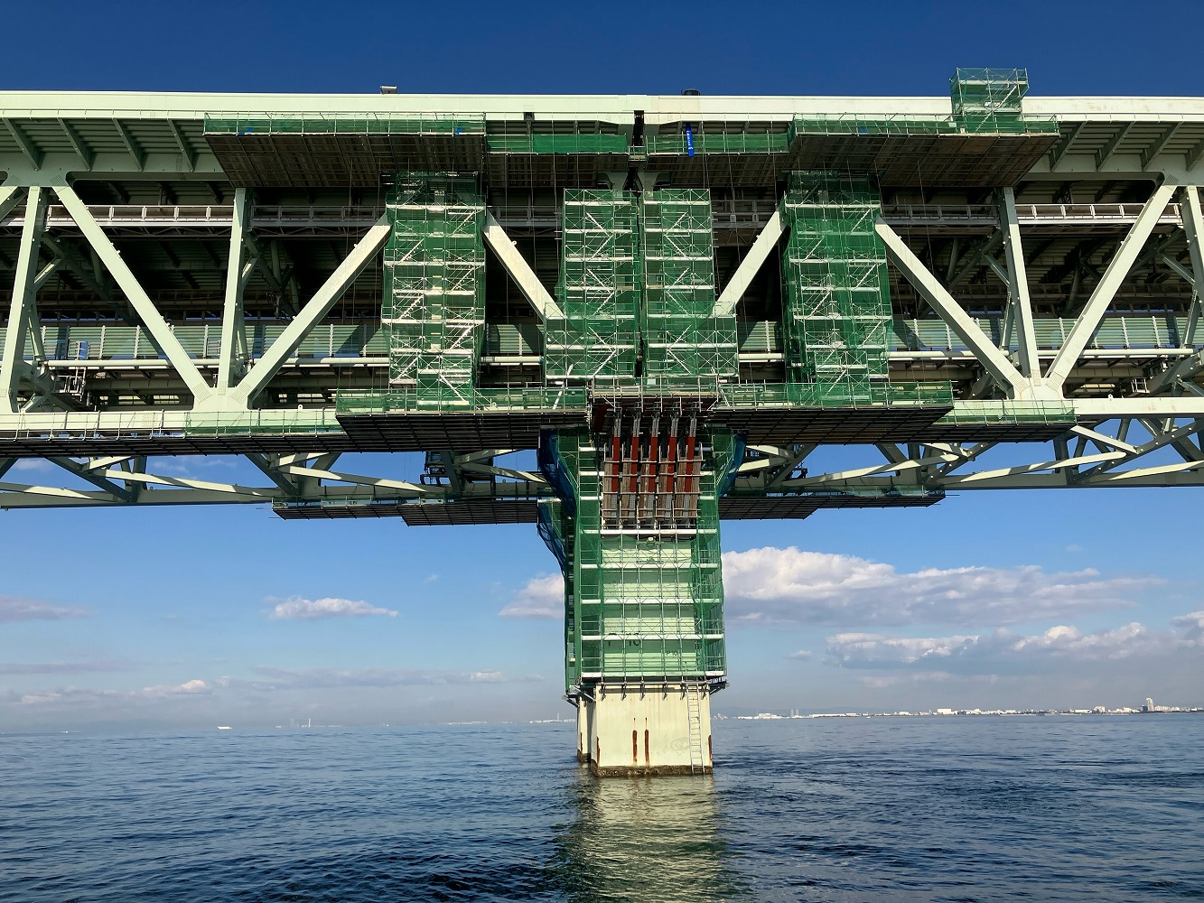 井上 例えば複雑な耐震補強の例では、まず関西国際空港連絡橋があります。トラス橋や箱桁などの補強を行っていますが、形式や橋長などの規模もさることながら、鉄道と道路橋という、示方書や要領など基準(とりわけ勾配許容度などが著しく違う、また鉄道のため基本的に運行を止められない。また道路橋の耐震補強であっても隣接する鉄道橋部に影響を伴う個所は工事を大きく制約される)の異なる工種を、NEXCO西日本、南海電鉄、JR西日本、関西国際空港運営会社など異なる機関と調整しながら工事を進めていくのは非常に大変ですが、これからはますます要求されることであろうと考えていますので、新鮮な取り組みでありますし、やりがいも感じています。