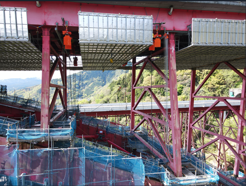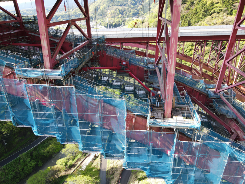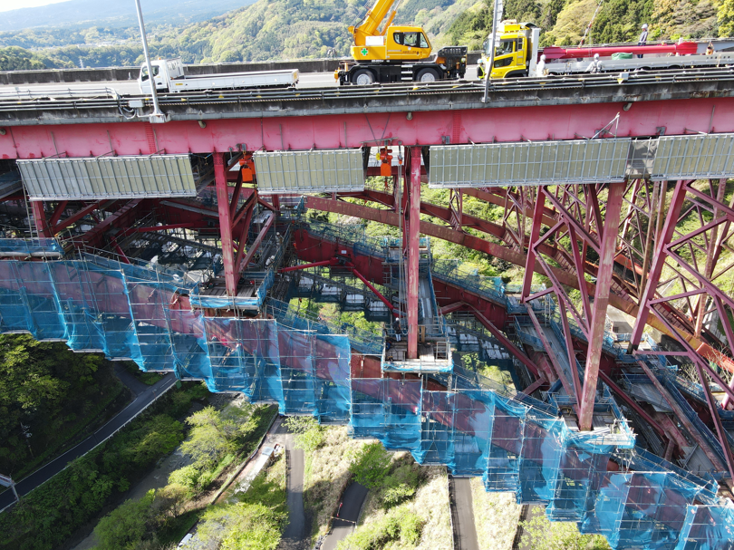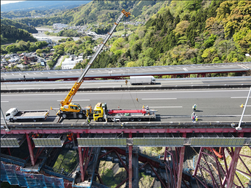 井上 東名の皆瀬川橋があります。橋長332mの鋼単純逆ローゼ橋で、アーチ支間は200mあり、アーチライズは40mに達する橋梁の耐震補強を行いました。非常に通行量が多いとかそこの絶対止められないようなところで、いかに施工していくか、技術的にも高い能力が要求される耐震補強が求められる工事は、我々の強みが生かせますし、実際に手ごたえも感じました。