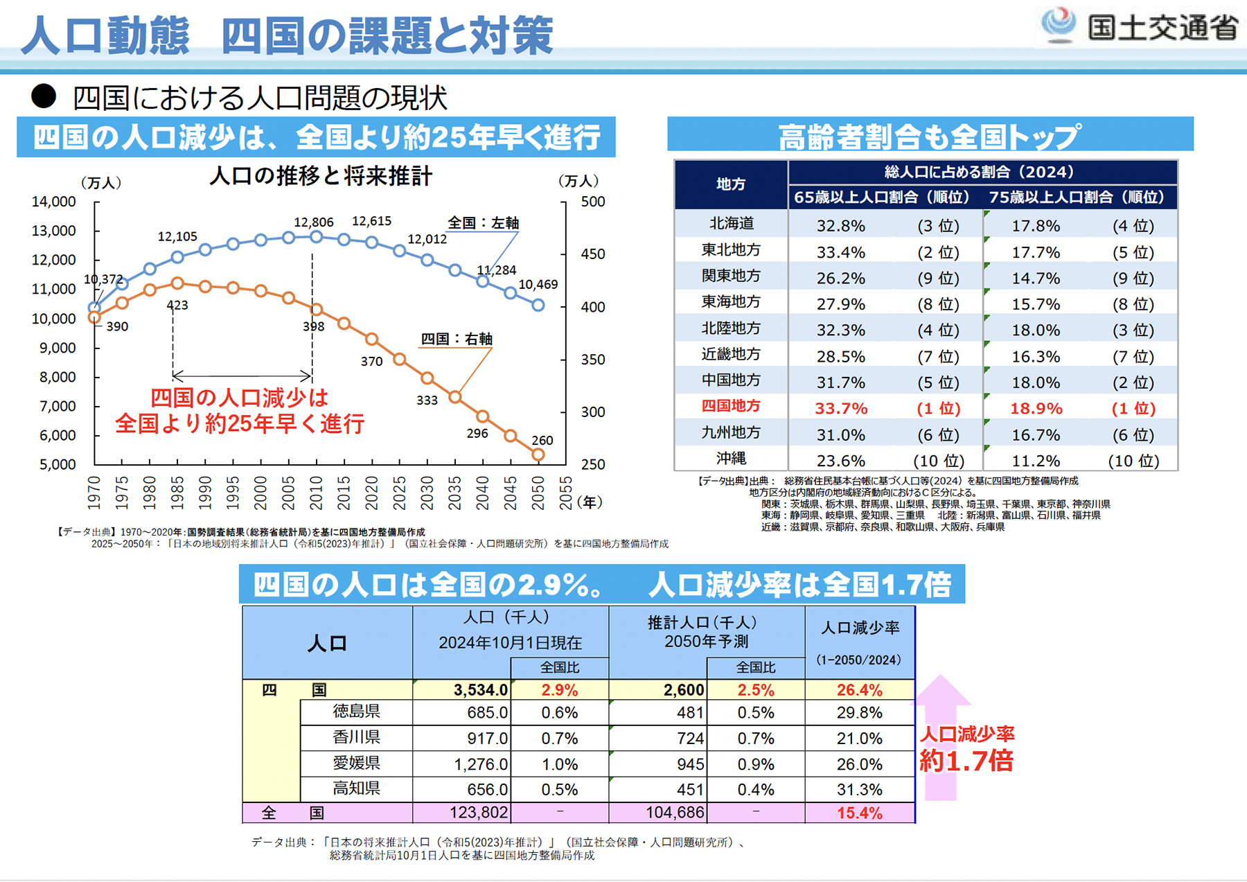 四国の地域特性をお話しするにあたり、まず申し上げたいのは、人口動態や産業構造、さらには自然条件まで、複数の面で全国とは異なる特徴が重なっている地域であるという点です。全国の人口が2010年頃を境に減少へ転じたのに対し、四国ではそれより早い時期から人口減少が進んでおり、現在の人口シェアは全国の約2.9%、将来的には2.5%程度まで縮小すると見込まれています。高齢化も全国平均以上のペースで進んでおり、地域を支える人材の確保が引き続き課題となっています。