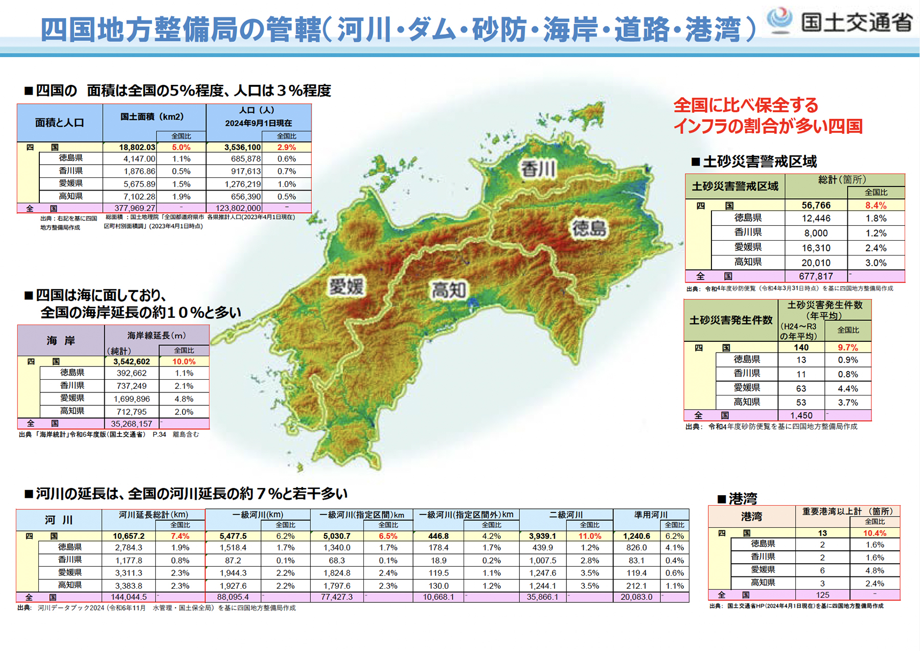 四国地方整備局は、道路は国道11路線・約1,300kmと四国横断自動車道約40km、河川は一級河川8水系約452kmを管理している。四国は豊かな自然に恵まれ、四国遍路の文化もあり、観光も盛んな地域である一方、南海トラフ地震の切迫性に加え、瀬戸内側の渇水リスクと太平洋側の豪雨リスクという対照的な気候条件を併せ持つ地域でもある。近年は気候変動の影響により短時間強雨の発生頻度が増加しているとされ、従来以上に防災・減災対策の重要性が高まっている。