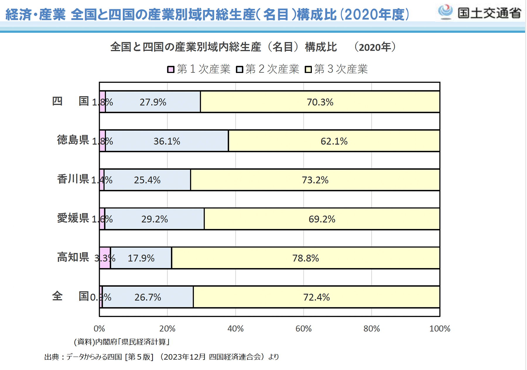 産業構成をみると、四国全体では一次・二次・三次産業の比率が全国と大きく乖離しているわけではありませんが、県ごとに特色が見られます。例えば、徳島や愛媛では製造業が比較的強く、一方で香川や高知では観光やサービス業など第三次産業の比率が高い傾向にあります。瀬戸内国際芸術祭、阿波おどり、よさこい祭り、道後温泉、今治タオル、なると金時といった地域資源も各地に広く存在し、地域としての潜在力は高いと感じています。