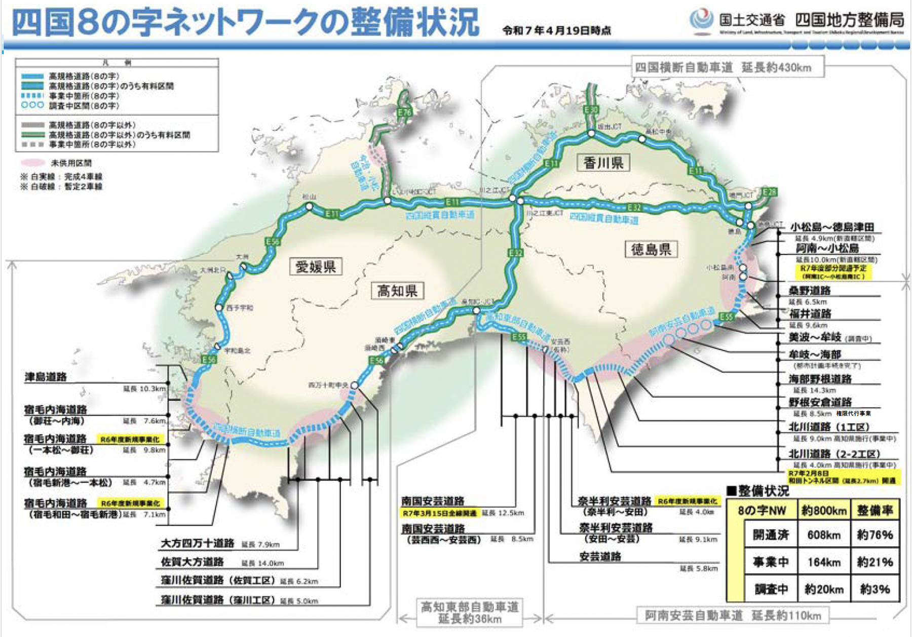 中でも徳島・高知の沿岸部をつなぐ阿南安芸自動車道は、災害時の孤立を防ぐうえで欠かせない路線で、今年度も調査中区間の調査や設計、事業化に向けた検討を進めています。沿岸地域は津波リスクが高く、代替ルートも少ないことから、早期の整備が強く求められています。