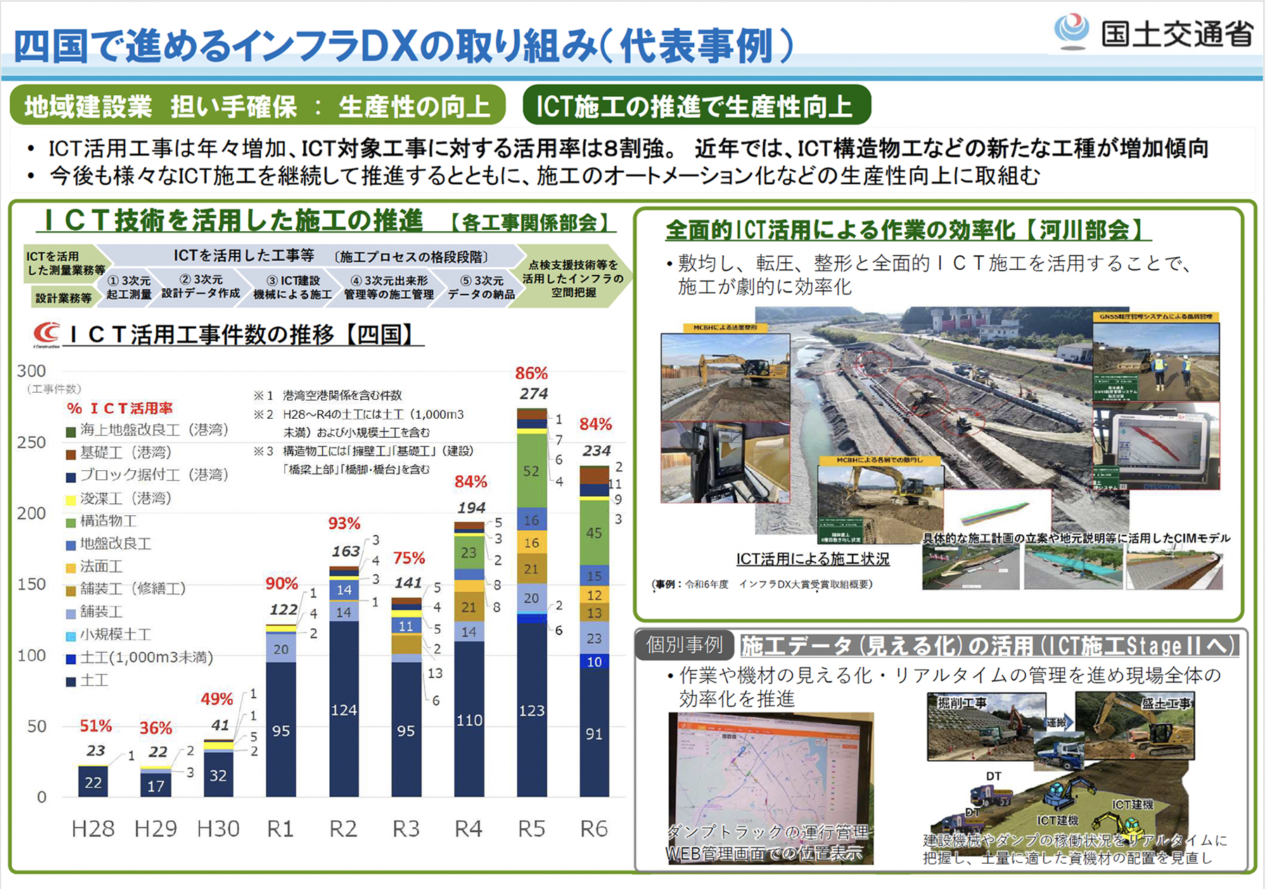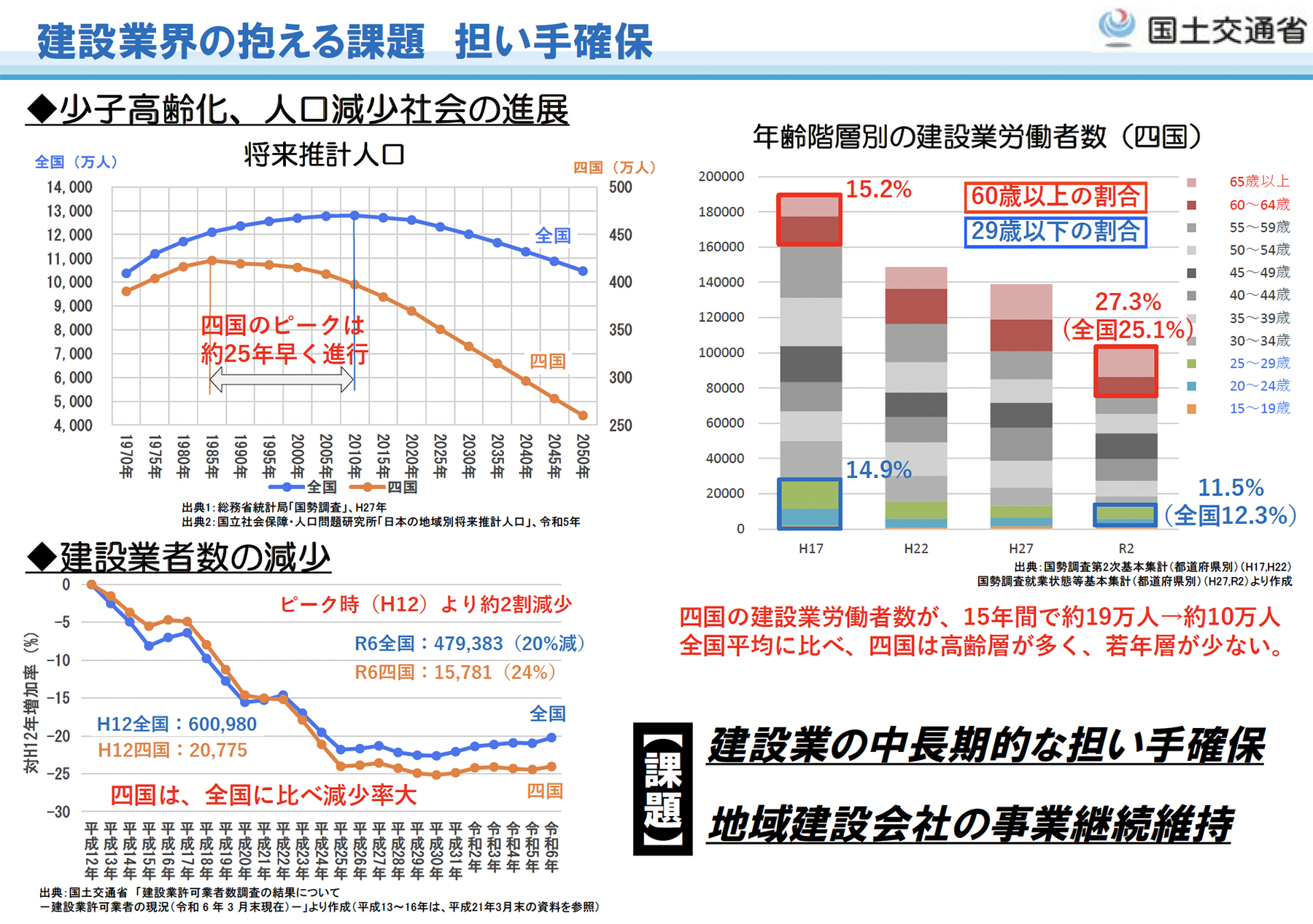 こうした災害対策の強化は、結果として地域の競争力や持続的な成長にもつながるものです。しかし、四国は全国と比べても人口減少の進行が早く、災害リスクへの対応とインフラ管理を担う人材の確保が大きな課題となっています。そのため、DXの先行導入による省人化や効率化、そして建設産業の魅力を広く伝える広報活動は、他地域以上に重要性が高いと感じています。
