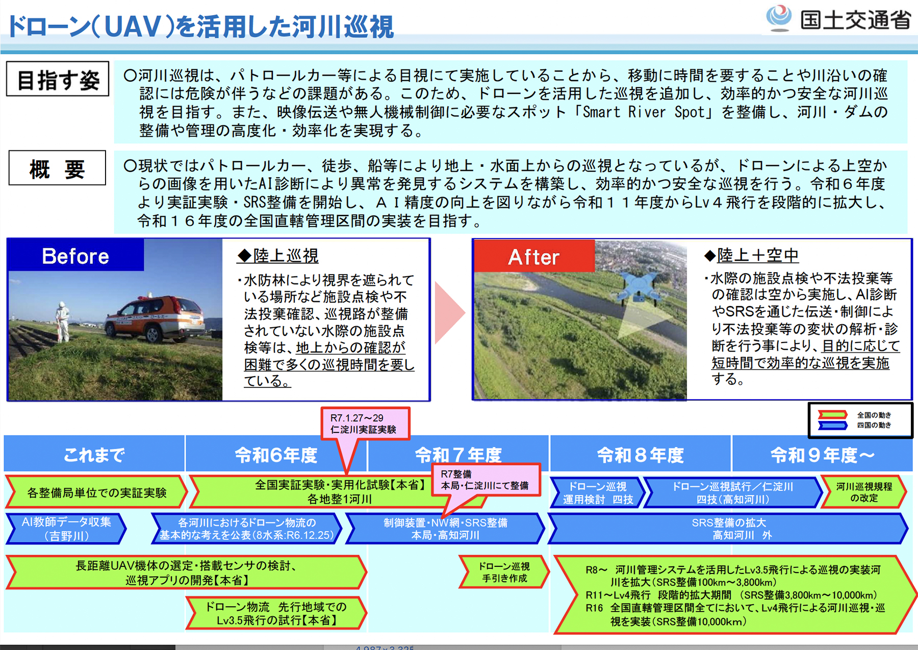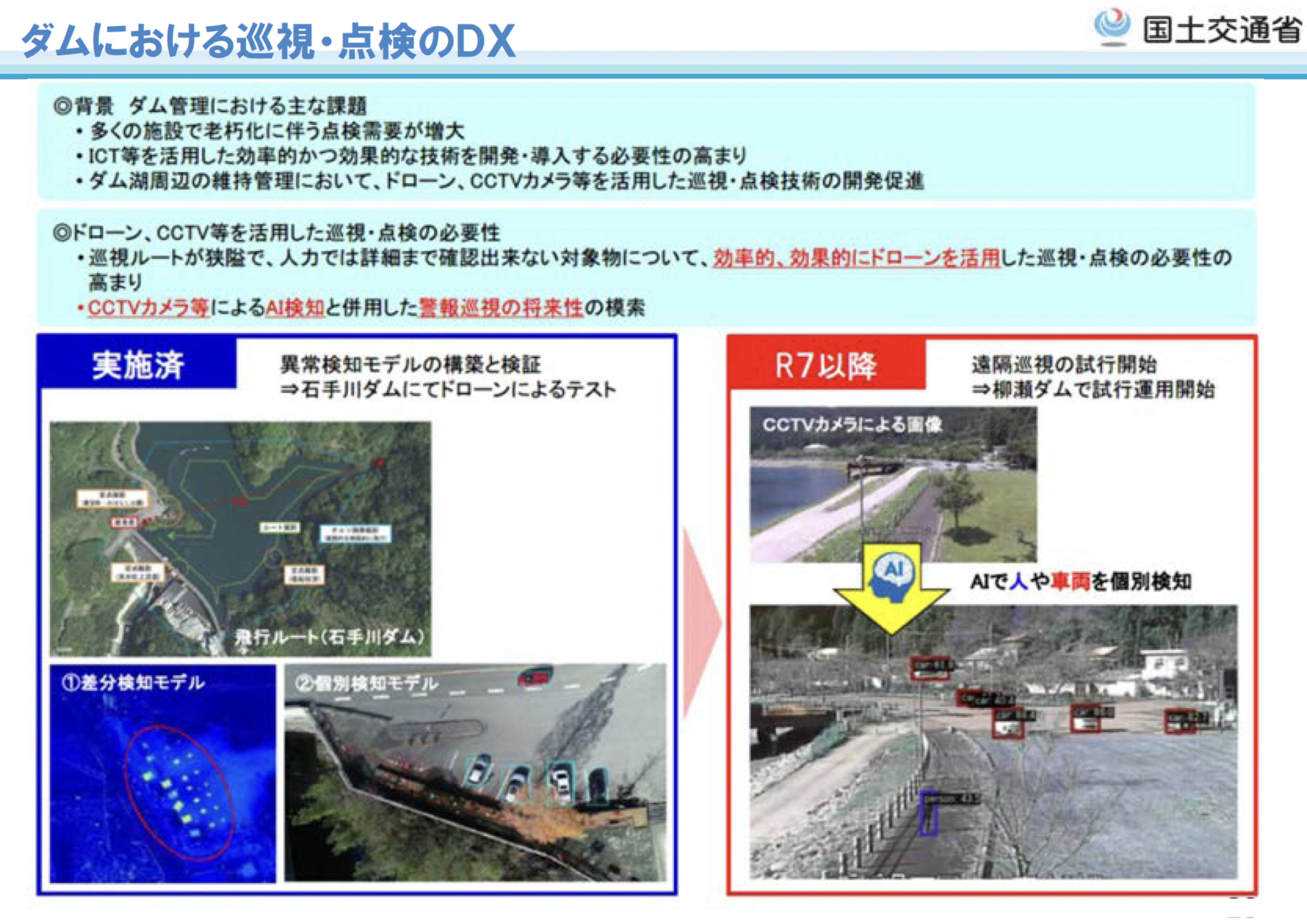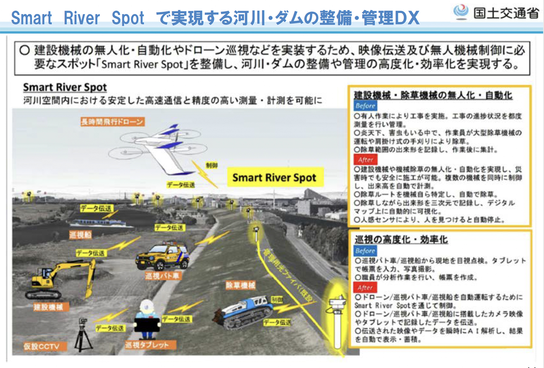 その中核となる取り組みの一つが、直轄管理区間を対象とした「スマートリバースポット」です。除草ロボットによる自動除草、ドローンによる定期的な巡視・撮影、AIによる画像解析といった自動化・遠隔化技術を組み合わせ、省力的で効率的な維持管理を実現する仕組みです。無人化施工や点検支援技術の導入も進めており、河川・道路・ダム・国道の維持管理の高度化につなげていきます。