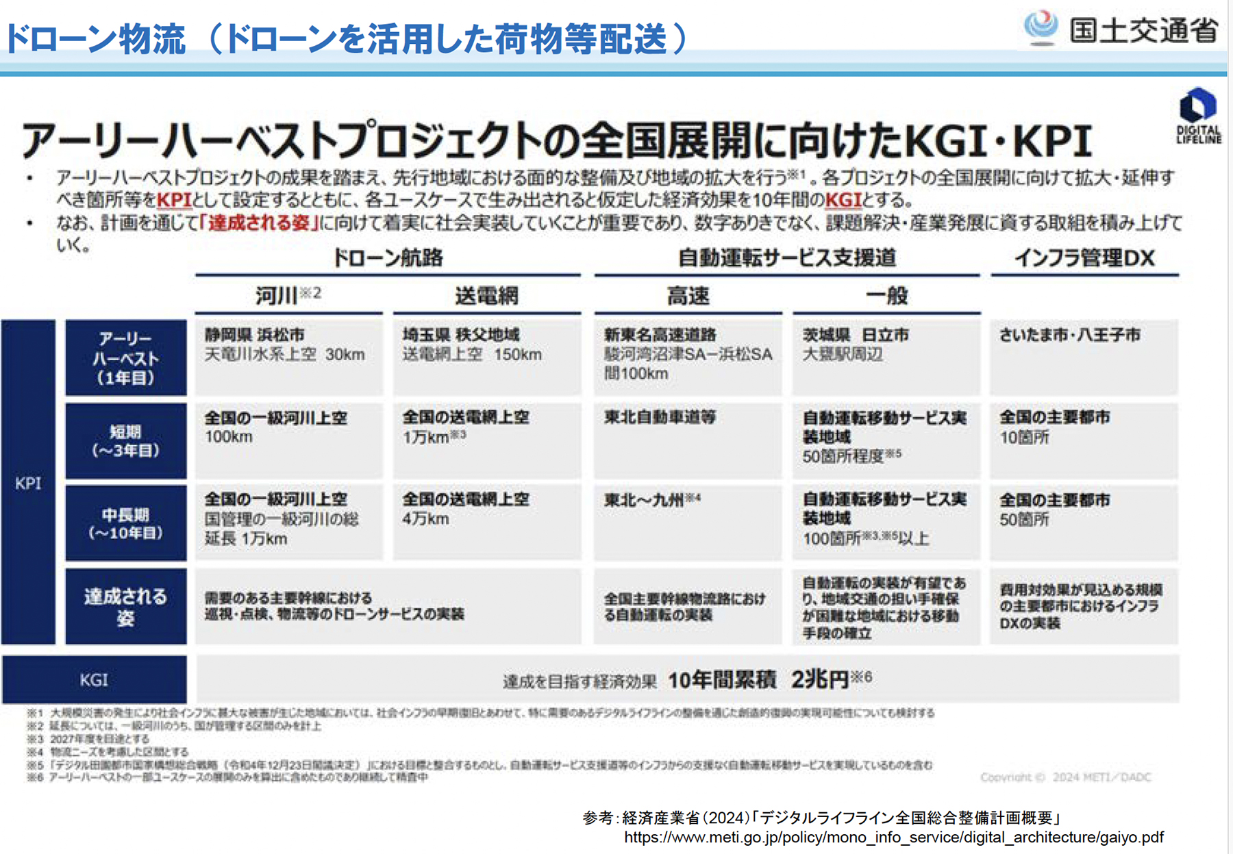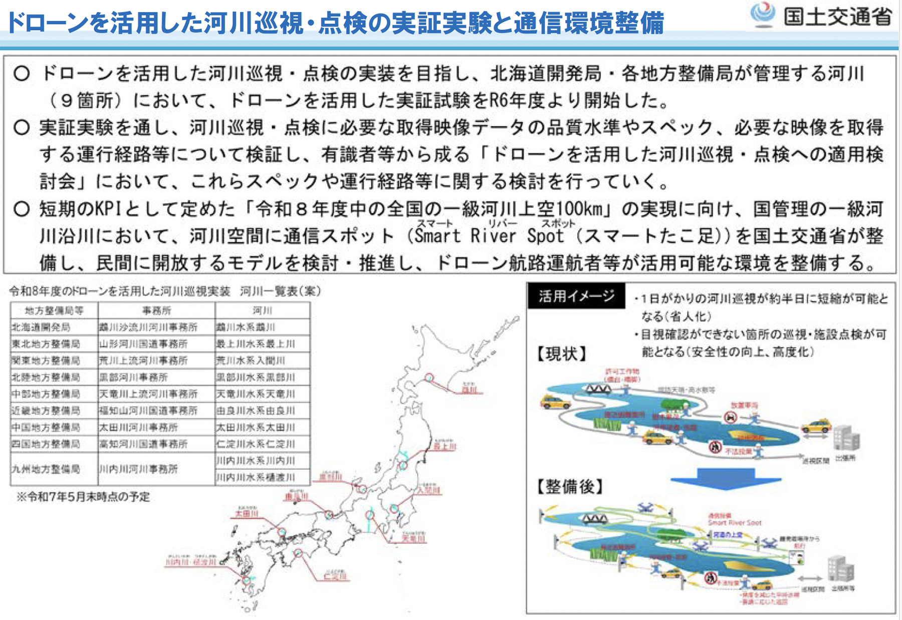 これらの取り組みを後押ししているのが、国が進める「デジタルライフライン全国総合整備計画」です。自動運転やドローン物流といったデジタルインフラを全国で整備していく構想で、河川上空を活用したドローン物流の実証や通信環境整備は、将来的に河川管理の効率化にもつながります。物流事業者が使う通信インフラと河川管理のDX基盤は重なる部分が多く、相乗効果が期待される分野です。