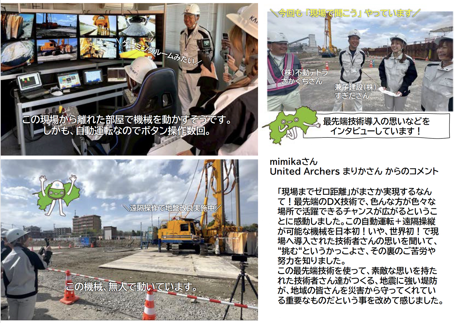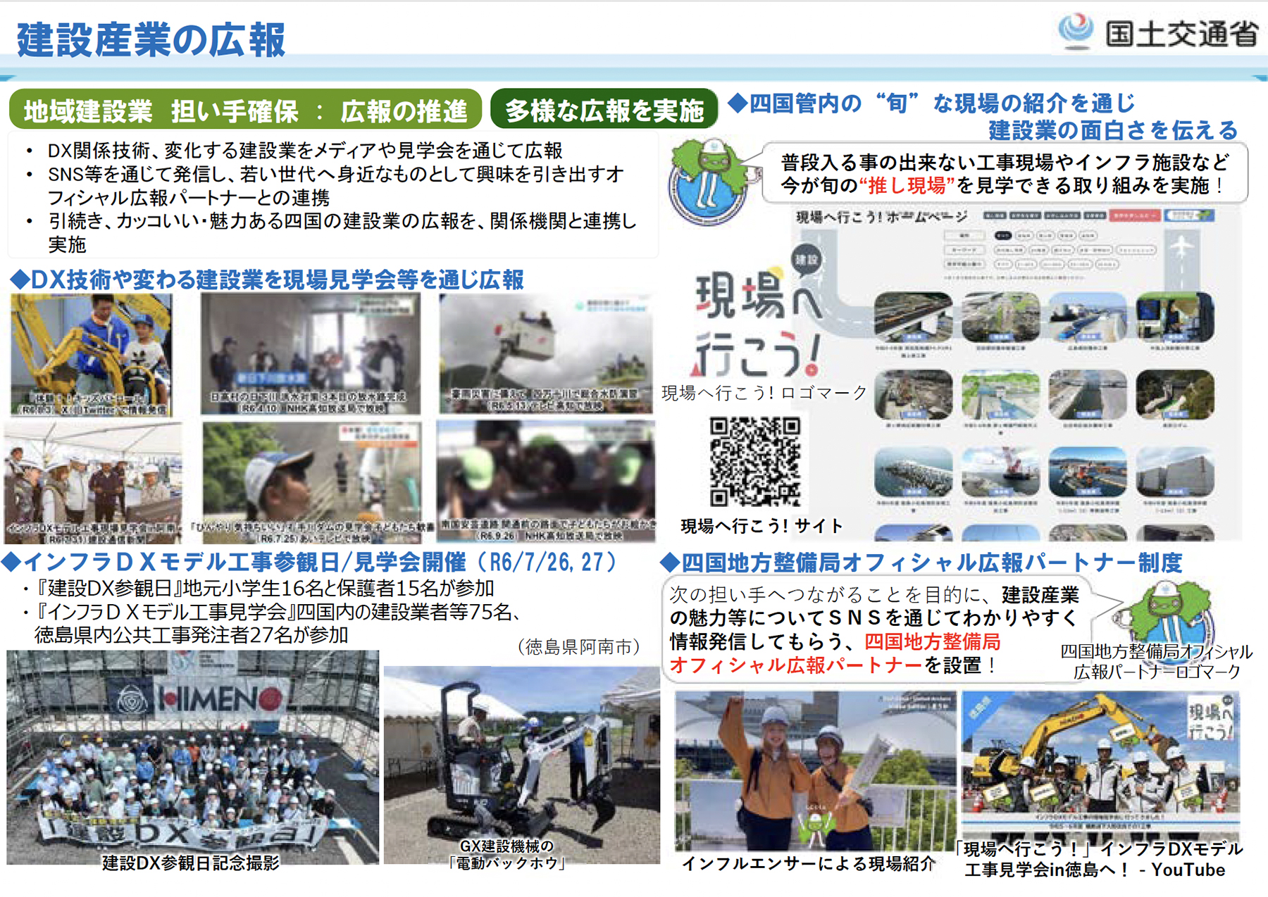 さらに、建設産業の魅力発信にも力を入れています。四国では、「四国地方整備局オフィシャル広報パートナー」としてSNSで発信力のある地域のアーティストやクリエイターと連携し、現場見学や作業体験を通じて建設業の仕事の面白さや社会的意義を発信する取り組みを進めています。こうした施策は、新しい層へのアプローチが可能で、建設産業への理解促進にも大きな効果を上げています。