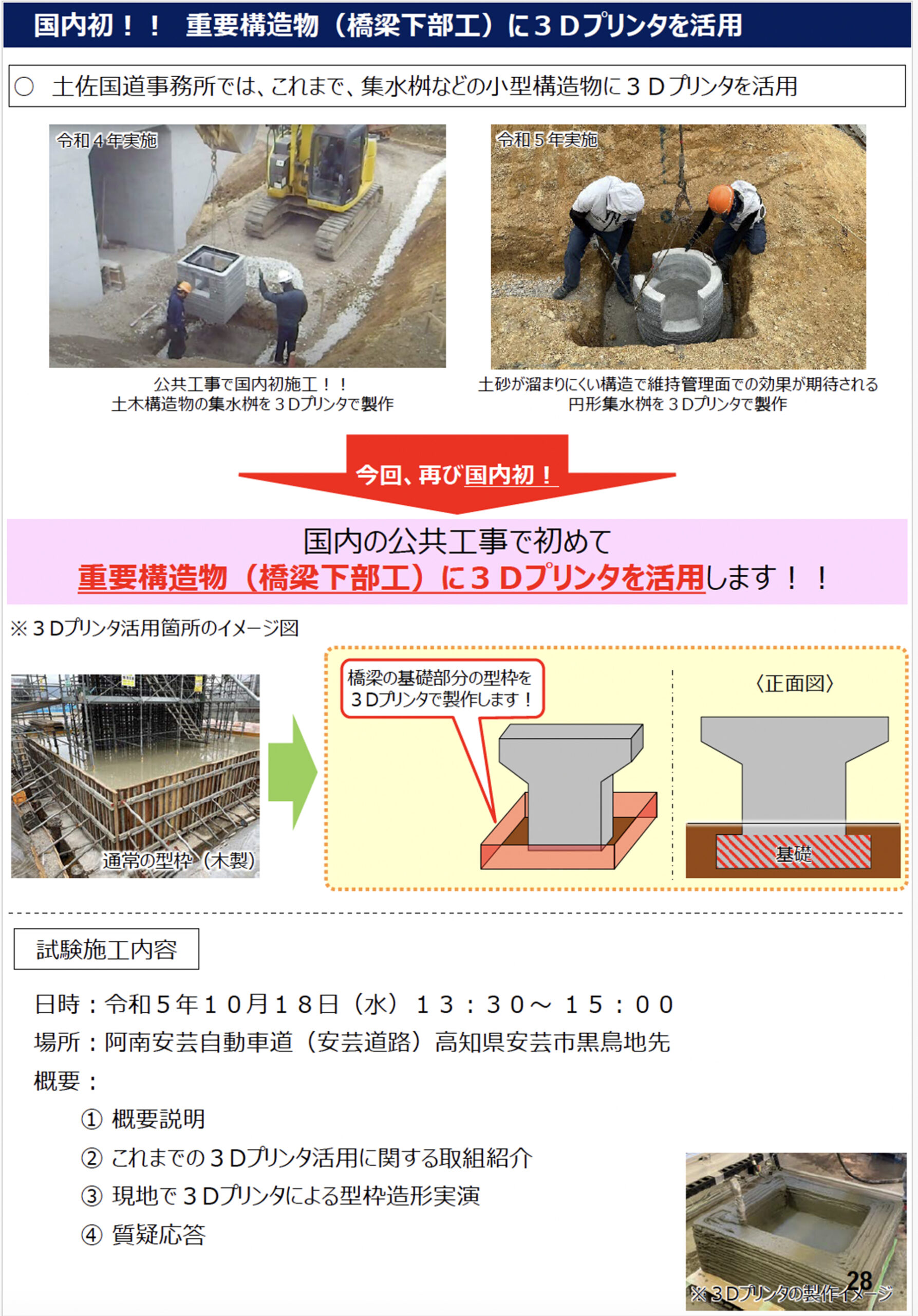 さらに令和5年には、維持管理性の向上を期待できる円形集水桝や、橋梁下部工に用いる埋設型枠を3Dプリンタで製作するなど、適用範囲を拡大しています。令和6年には、現場打ちで行われていた笠石コンクリート型枠への適用も行い、新材質・新工法の実用化に向けて検証を重ねてきました。