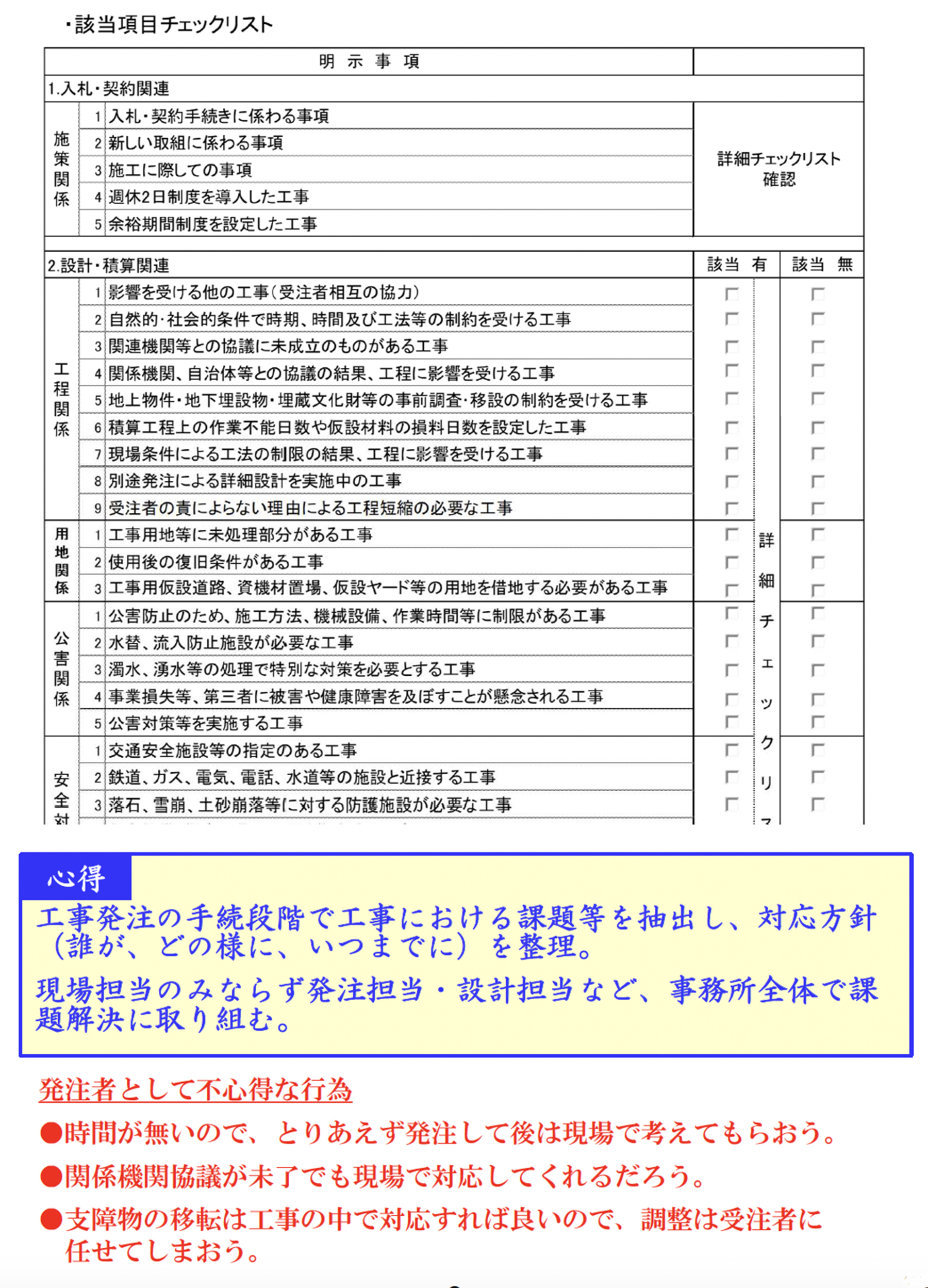 こうした背景を踏まえ、四国地方整備局では令和6年3月に「発注者の心得」を策定し、令和7年3月に改訂しました。これは発注者としての意識改革と業務改善を進め、設計成果の品質向上を図るとともに、働き方改革や生産性向上につなげ、事業をより円滑に推進することを目的とした取り組みです。「発注者の心得」では、設計段階から施工性や安全性を十分考慮し、現場施工を意識した設計を行うことを明確にしています。設計成果には施工計画をより充実させることを求め、条件明示チェックシートを活用して情報の漏れを防ぎ、情勢変化により条件が変わった場合には確実に更新し、工事発注前から工事実施段階まで確実に引き継ぐ仕組みを整えています。