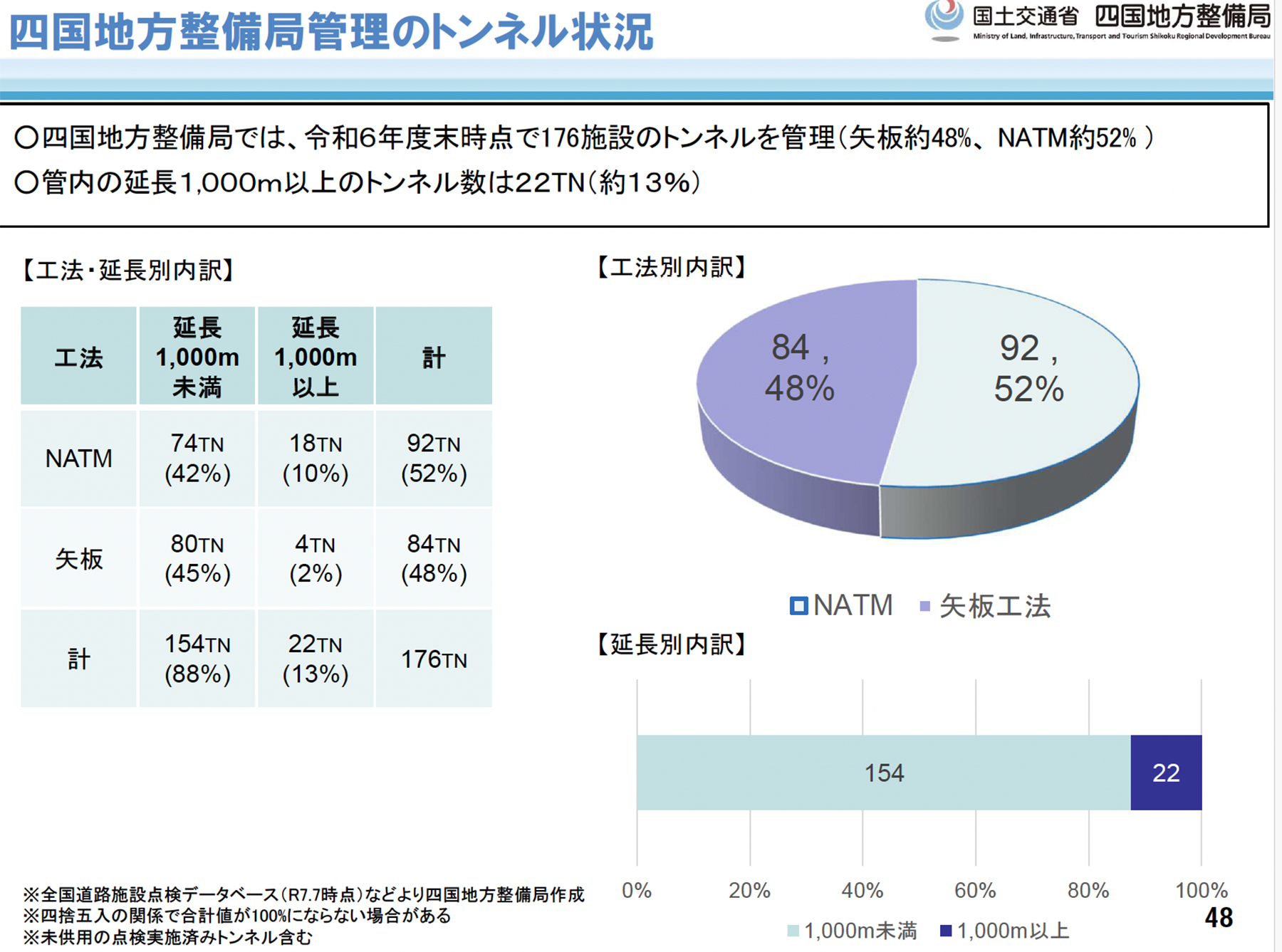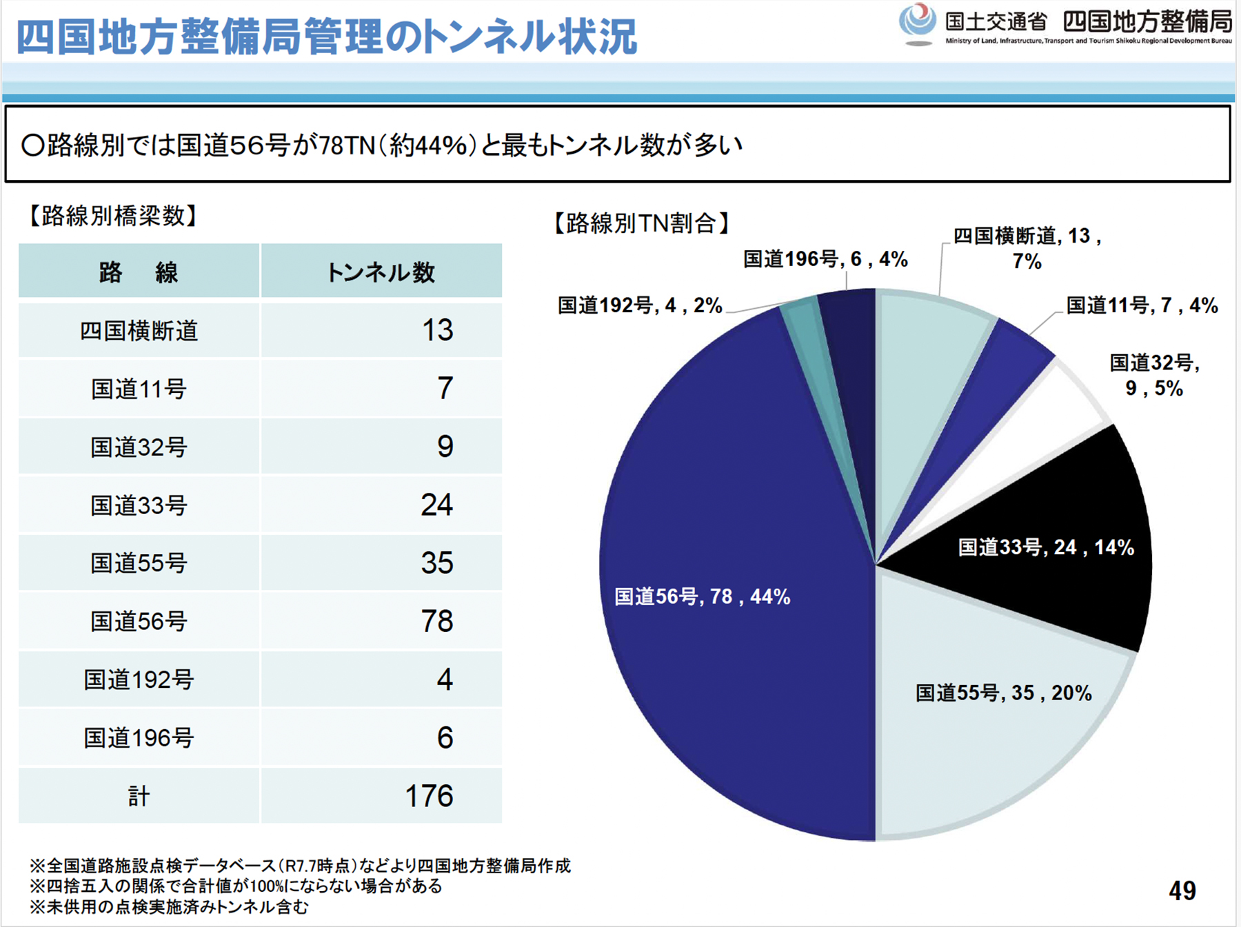 トンネルは全176トンネルを管理しており、工法別では矢板工法が約48%、NATM工法が約52%です。延長1,000m以上の長大トンネルは22トンネル(約13%)となっています。路線別では橋梁と同様に国道56号が最も多く、78トンネル(約44%)を占めています。供用後50年以上のトンネルは67トンネル(約38%)で、10年後には約46%、20年後には約57%まで増加する見通しです。