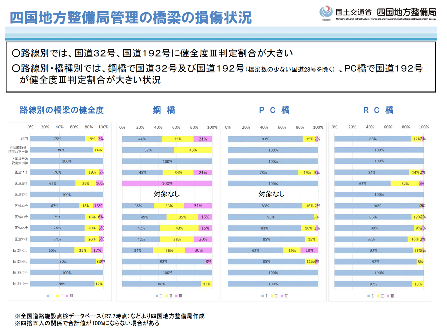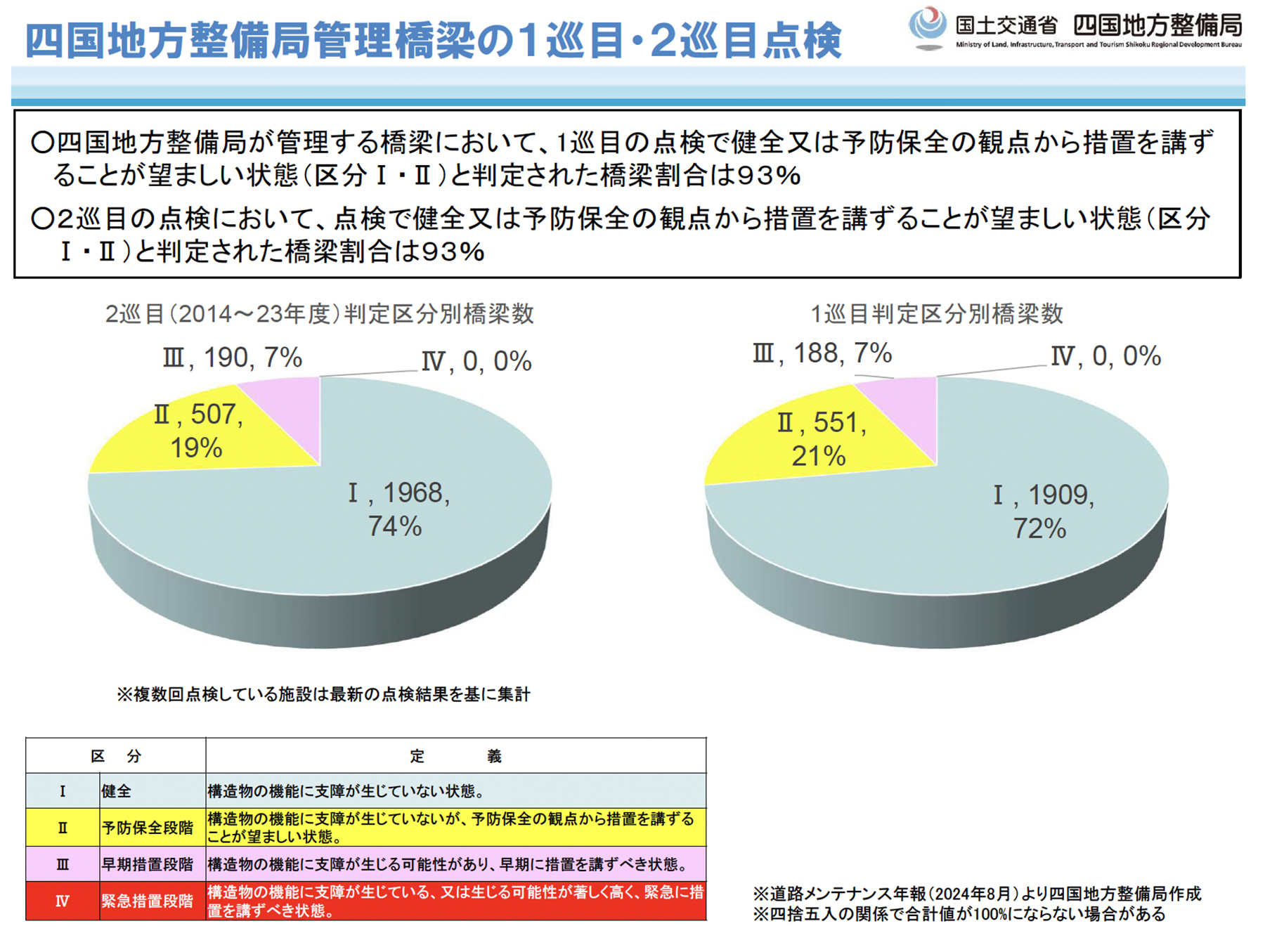 福本 まず橋梁についてですが、四国地方整備局が管理する橋梁では、1巡目の点検で「健全」または「予防保全の観点から措置を講ずることが望ましい状態」(Ⅰ・Ⅱ判定)と評価された橋梁は全体の93%でした。この傾向は2巡目点検でも同様で、Ⅰ・Ⅱ判定が93%となっています。