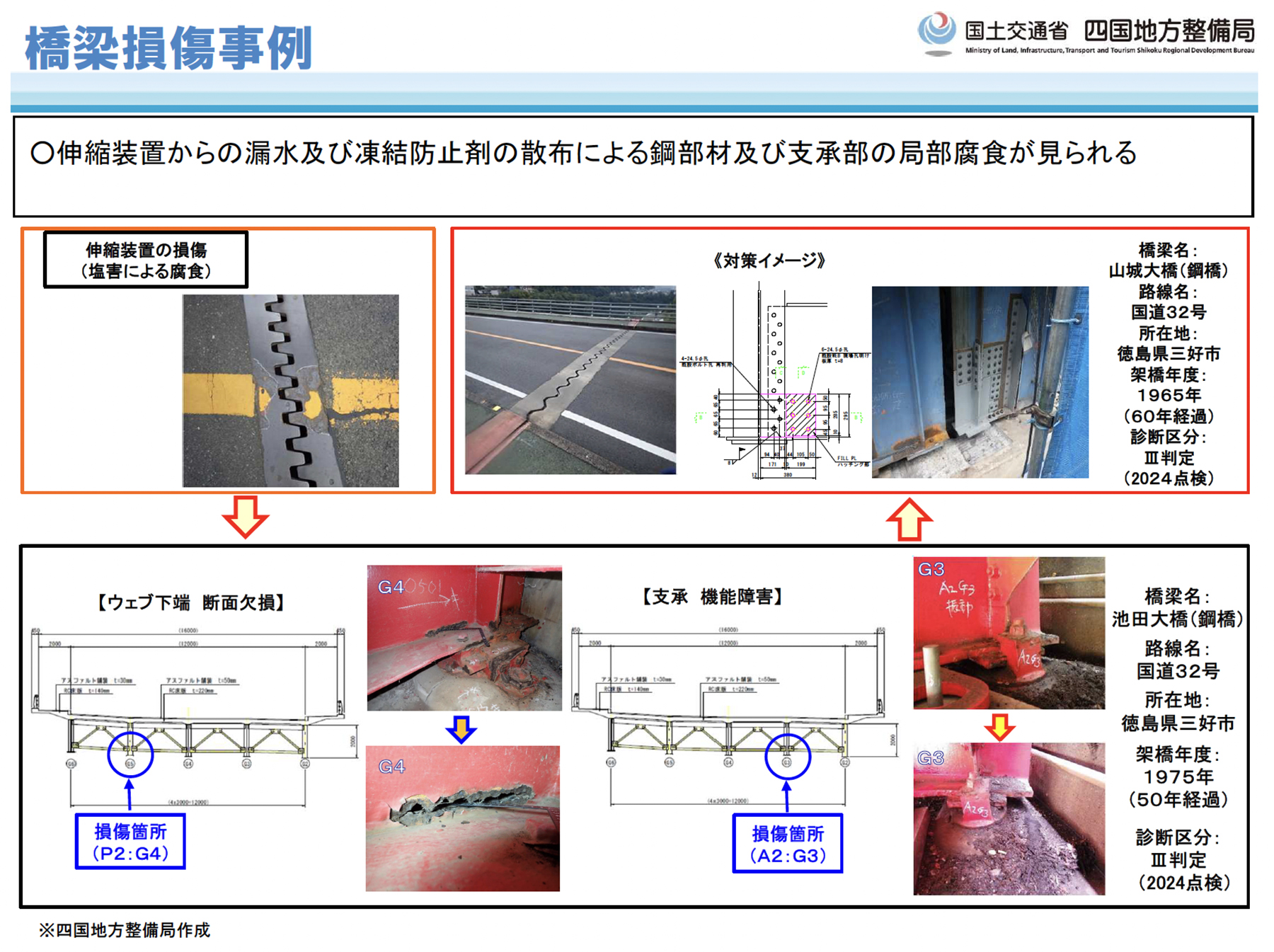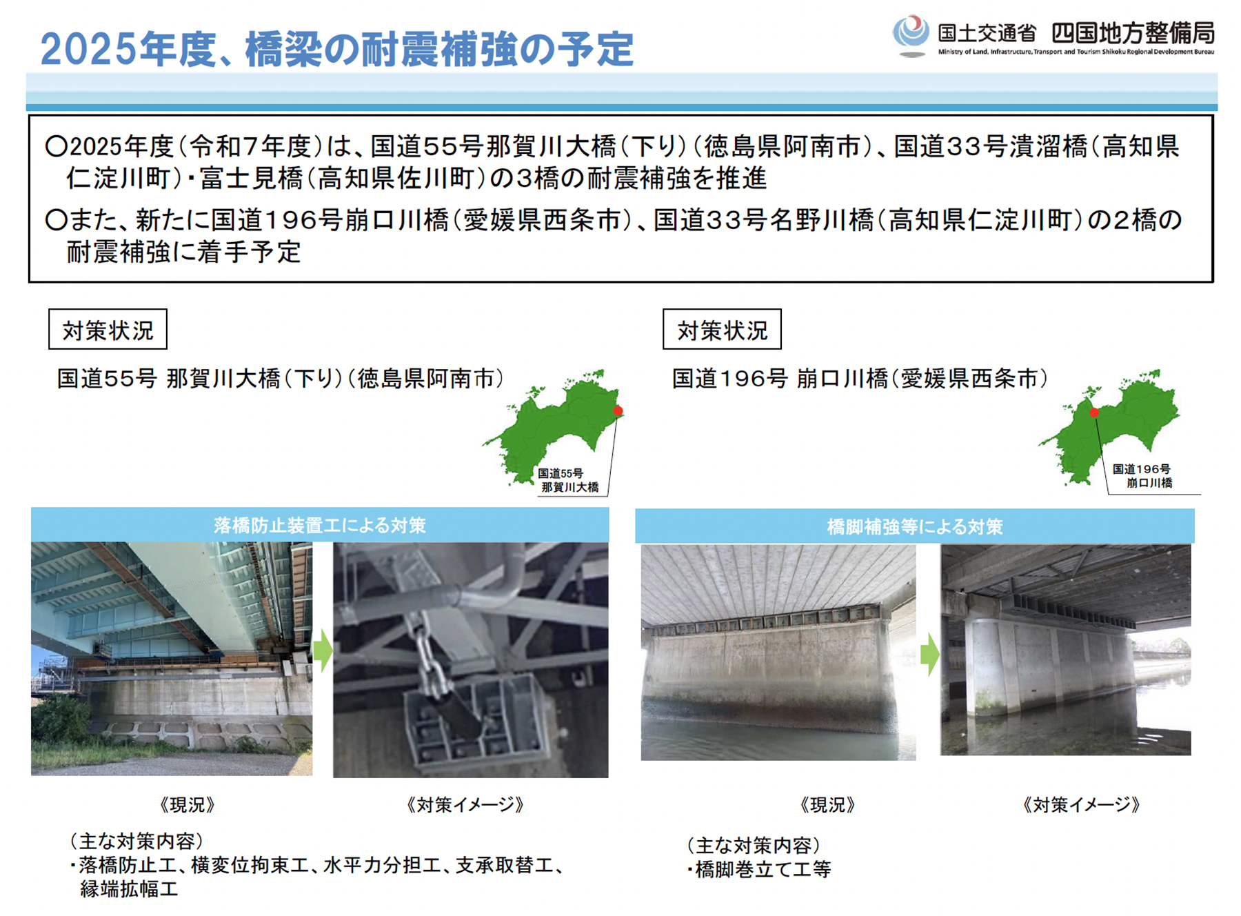 2025年度は、国道55号那賀川大橋(徳島県阿南市)、国道33号潰溜橋(高知県仁淀川町)、富士見橋(高知県佐川町)で耐震補強を推進するほか、新たに国道196号崩口川橋(愛媛県西条市)、国道33号名野川橋(高知県仁淀川町)の2橋で耐震補強に着手する予定です。
