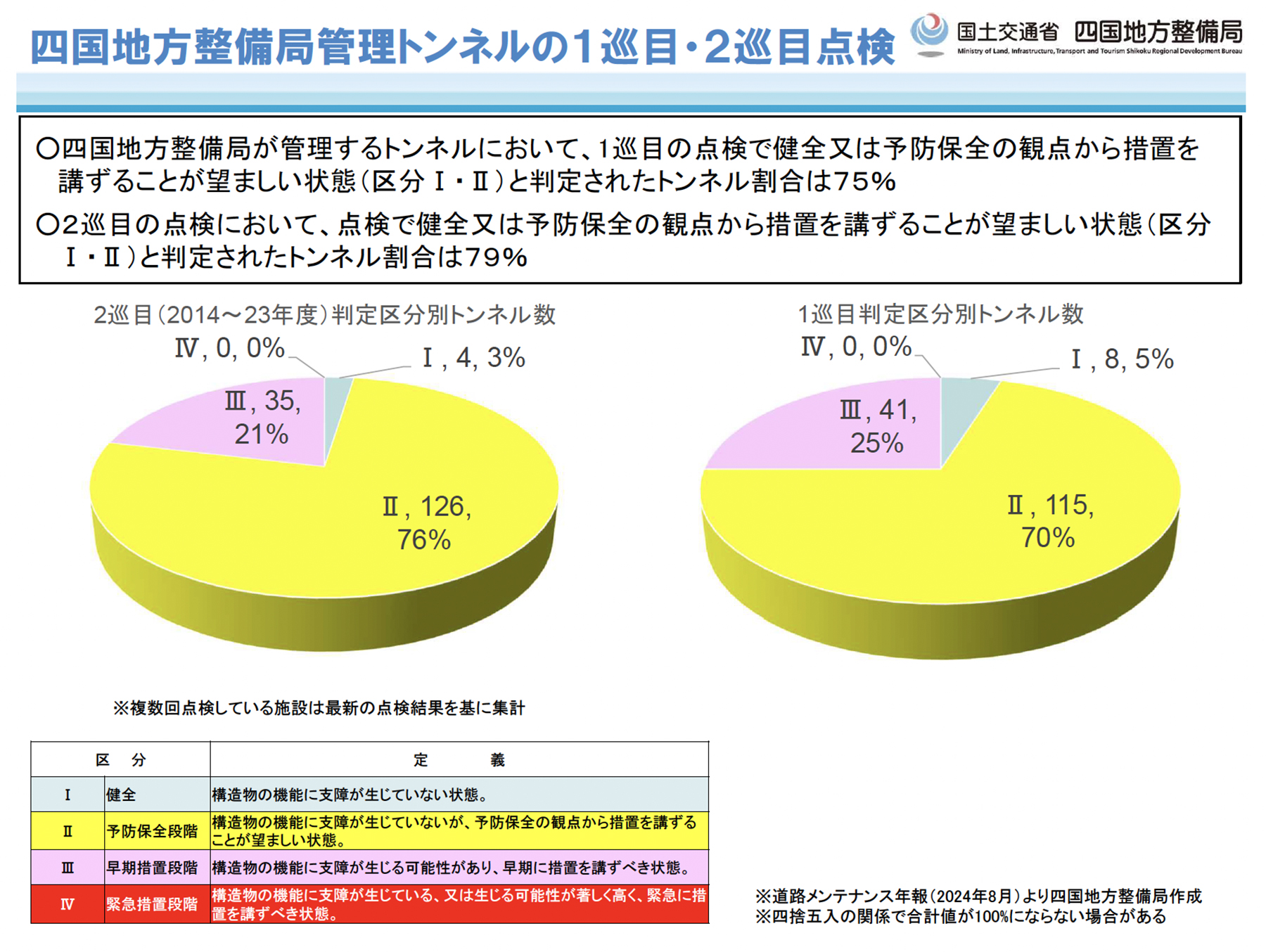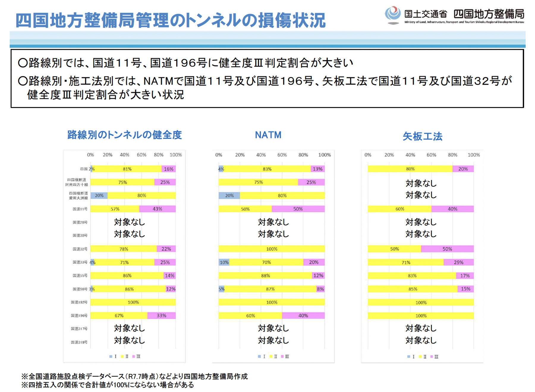 次にトンネルについてですが、1巡目点検でⅠ・Ⅱ判定だったものは75%で、2巡目では79%となっています。路線別では国道56号にⅢ判定が多いほか、工法別では矢板工法においてⅢ判定がやや高い割合で見られます。国道11号や196号ではⅢ判定の割合が多くなっています。