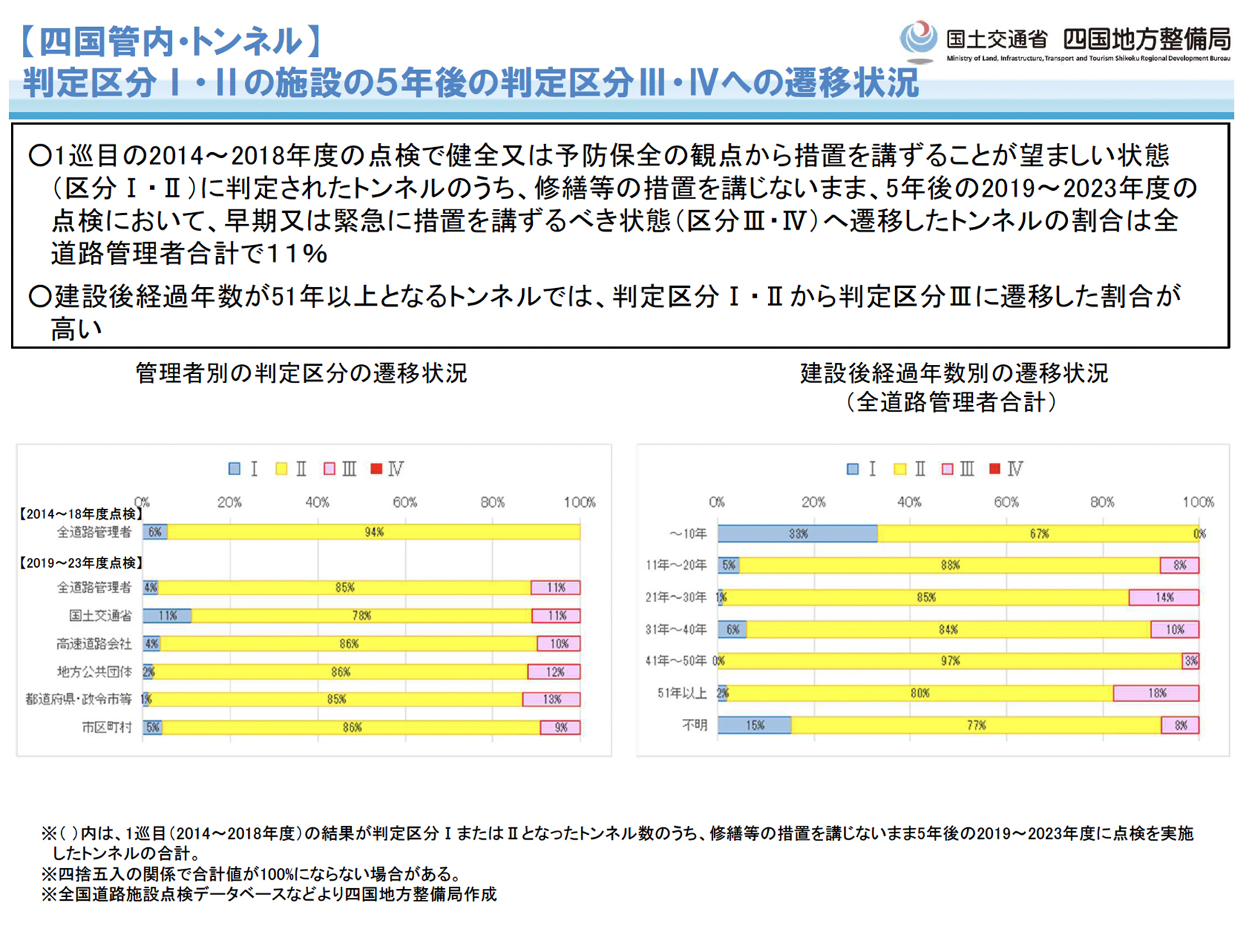 トンネルでは、全国で15%がⅠ・ⅡからⅢへ遷移したのに対し、四国では11%で、こちらも全国平均より低いものの、建設後51年以上経過したトンネルでは遷移率が大きく高まっている点が特徴です。