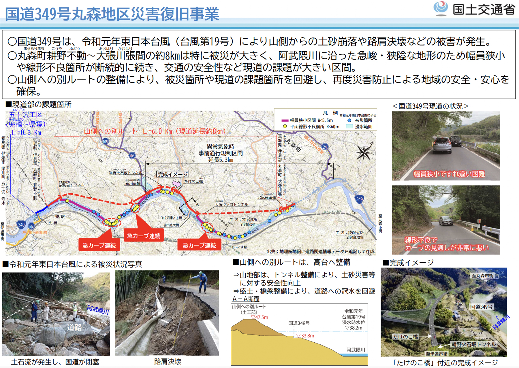 たとえば、宮城県丸森町の国道349号(宮城県管理)では、台風19号で甚大な被害を受けました。特に被災の大きかった約8kmの区間では現位置での安全な復旧が困難と判断され、有識者を交えた「丸森地区防災対策技術検討会」での議論を踏まえ、山側への別ルート整備が最適と結論づけられました。山側への別ルートは令和8年1月31日に開通します。