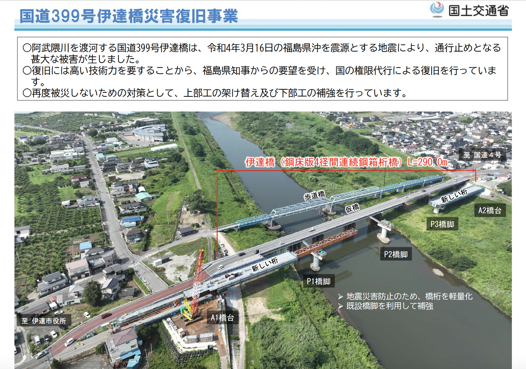 福島県伊達市の阿武隈川を渡る国道399号・伊達橋(福島県管理)では、福島県沖地震により上部工が変形する重大な被害が生じ、通行止めを余儀なくされました。復旧には高度な専門技術を要することから、国が権限代行により復旧を担っており、再度の被災を防止するため、上部工の架替えと下部工の補強を組み合わせた復旧工事を実施しております。