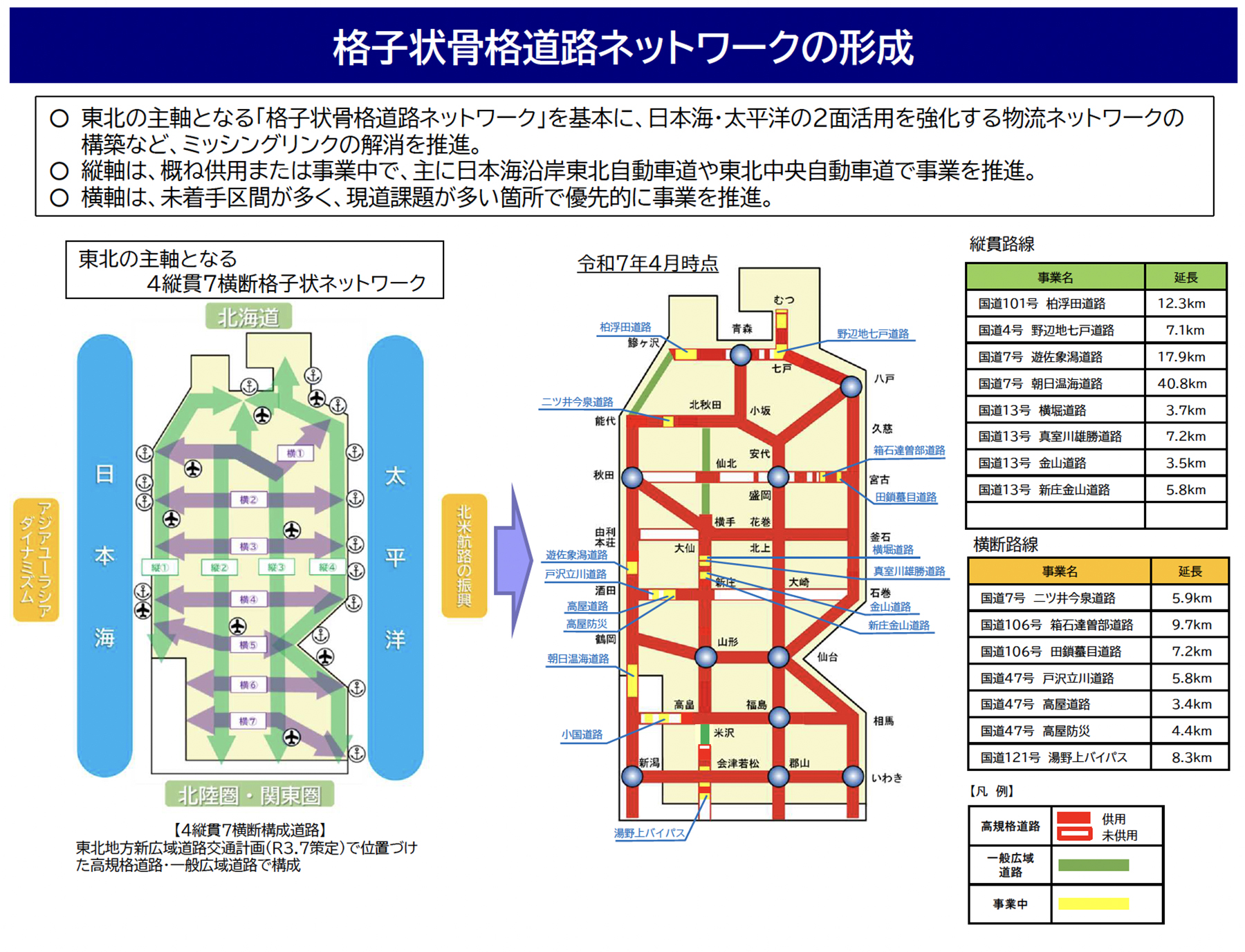 一方、横軸では、新庄酒田道路、新潟山形南部連絡道路、宮古盛岡横断道路などにおいて、現道の課題が特に大きい箇所から優先的に整備を進めているものの、まだ未着手区間が多く残っています。今後も地域の交通実態や物流需要を踏まえながら、段階的に事業を進めていく必要があります。