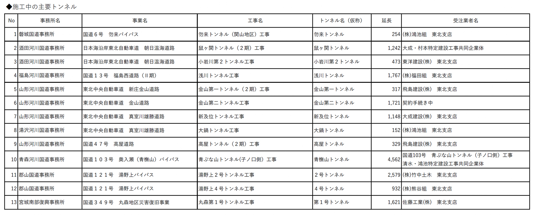 これらの橋梁に加え、全国的に地形が厳しい東北地域ではトンネル事業も重要であり、13箇所で工事が進行中です。いずれの工事においても、地域の交通の信頼性向上と防災力強化に資することを目標に、適切な工法を選択しながら着実に事業を推進しています。
