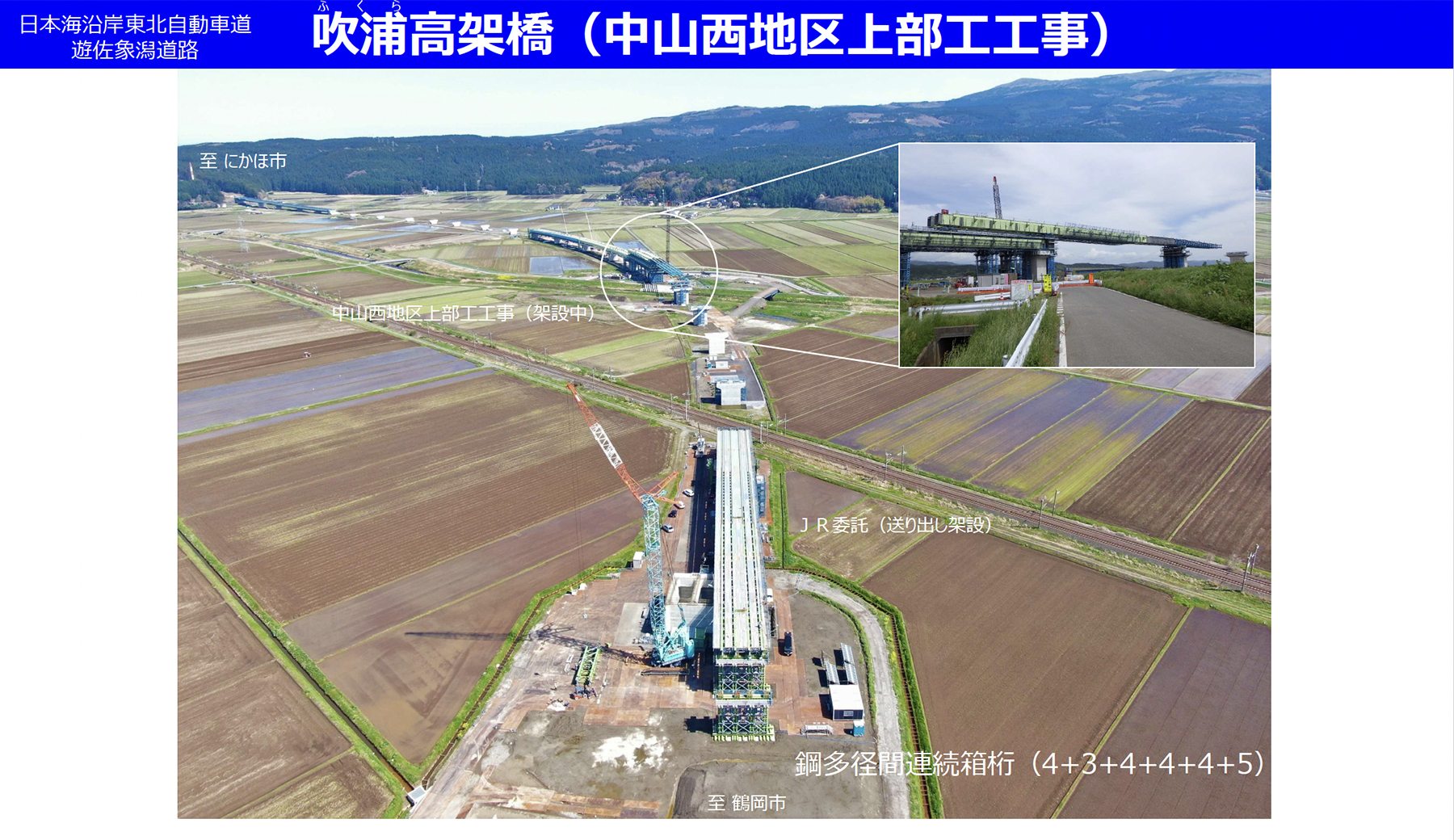 代表的な橋梁として、まず国道7号に位置する吹浦高架橋(鋼多径間連続箱桁、橋長1,741m)があります。この橋梁は6つのブロックに分割して施工しており、現在は4ブロックで上部工工事、残る2ブロックで床版工事を進めています。長大橋であることから、工程管理や安全管理を徹底しながら計画的に施工を進めています。