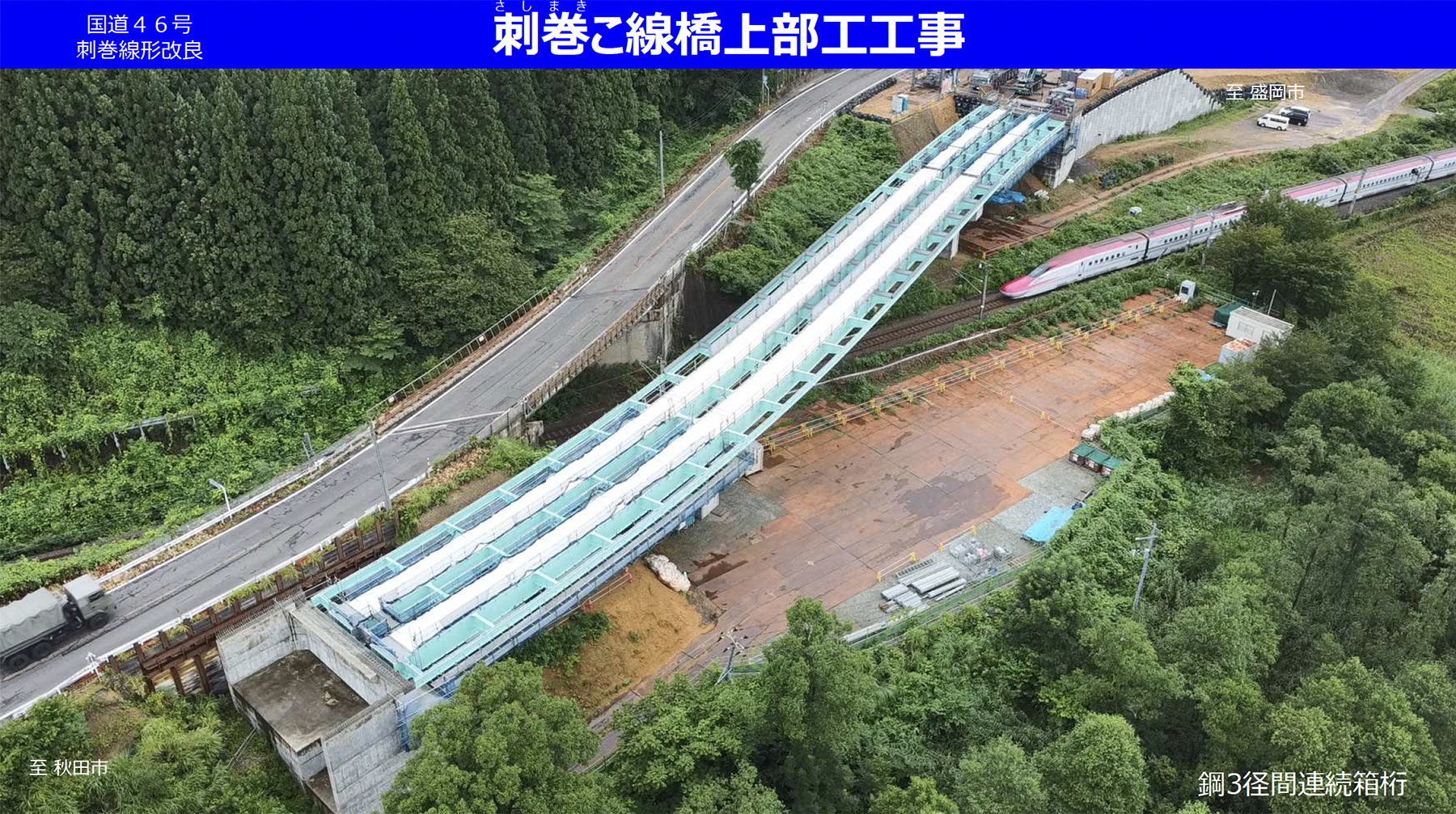 また、刺巻こ線橋(鋼3径間連続箱桁、橋長122m)では、鋼上部工の架設工事を進めているところです。線形条件が厳しい区間であるため、精度の高い施工が求められる橋梁です。