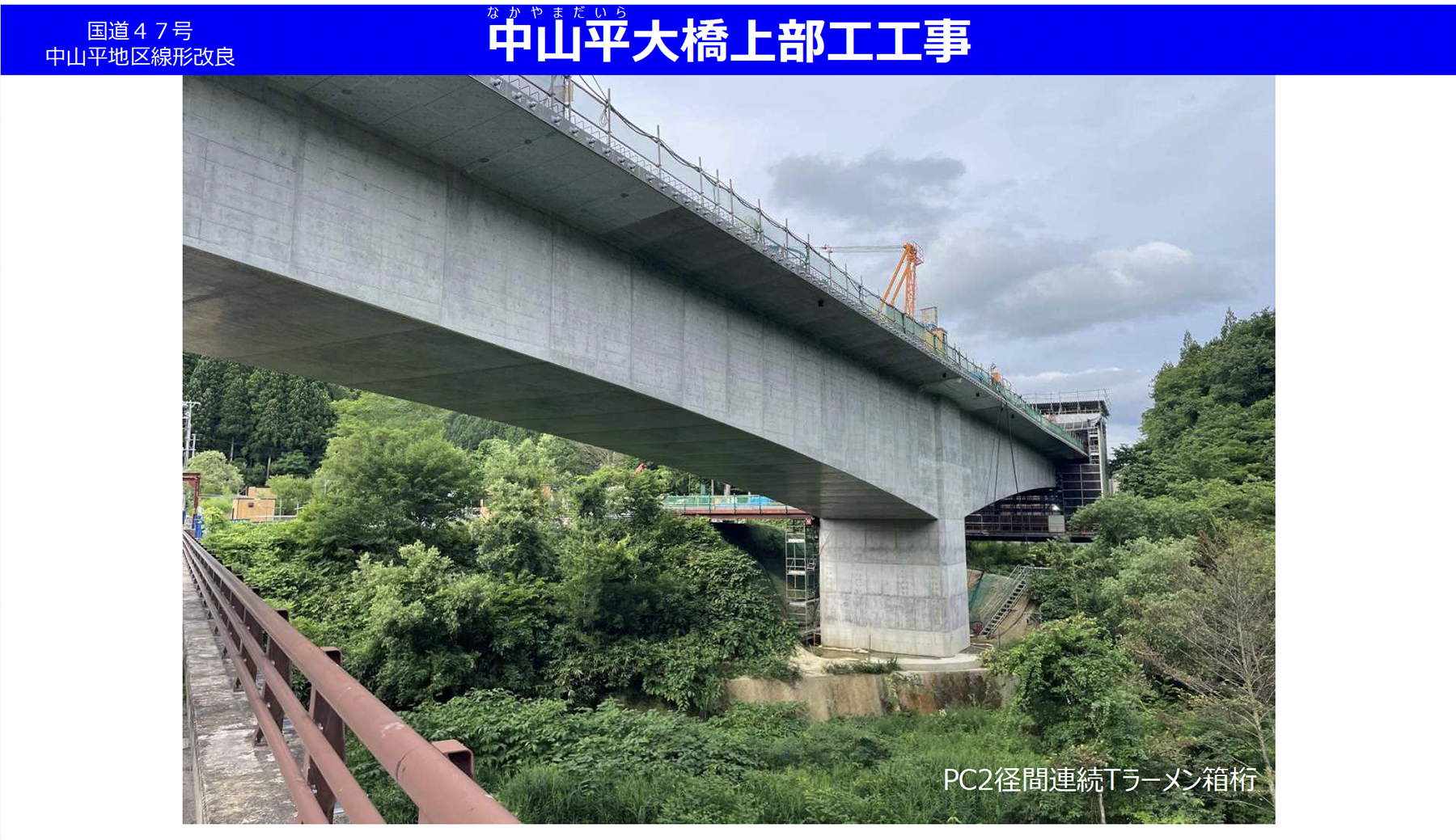 PC橋の事例としては、中山平大橋(PC2径間連続Tラーメン箱桁、橋長159m)が挙げられます。こちらも現在、上部工工事の施工段階にあり、PC構造特有の長支間を活かした橋梁形式の特徴を踏まえつつ、安全性と品質確保に注力しながら施工を進めています。