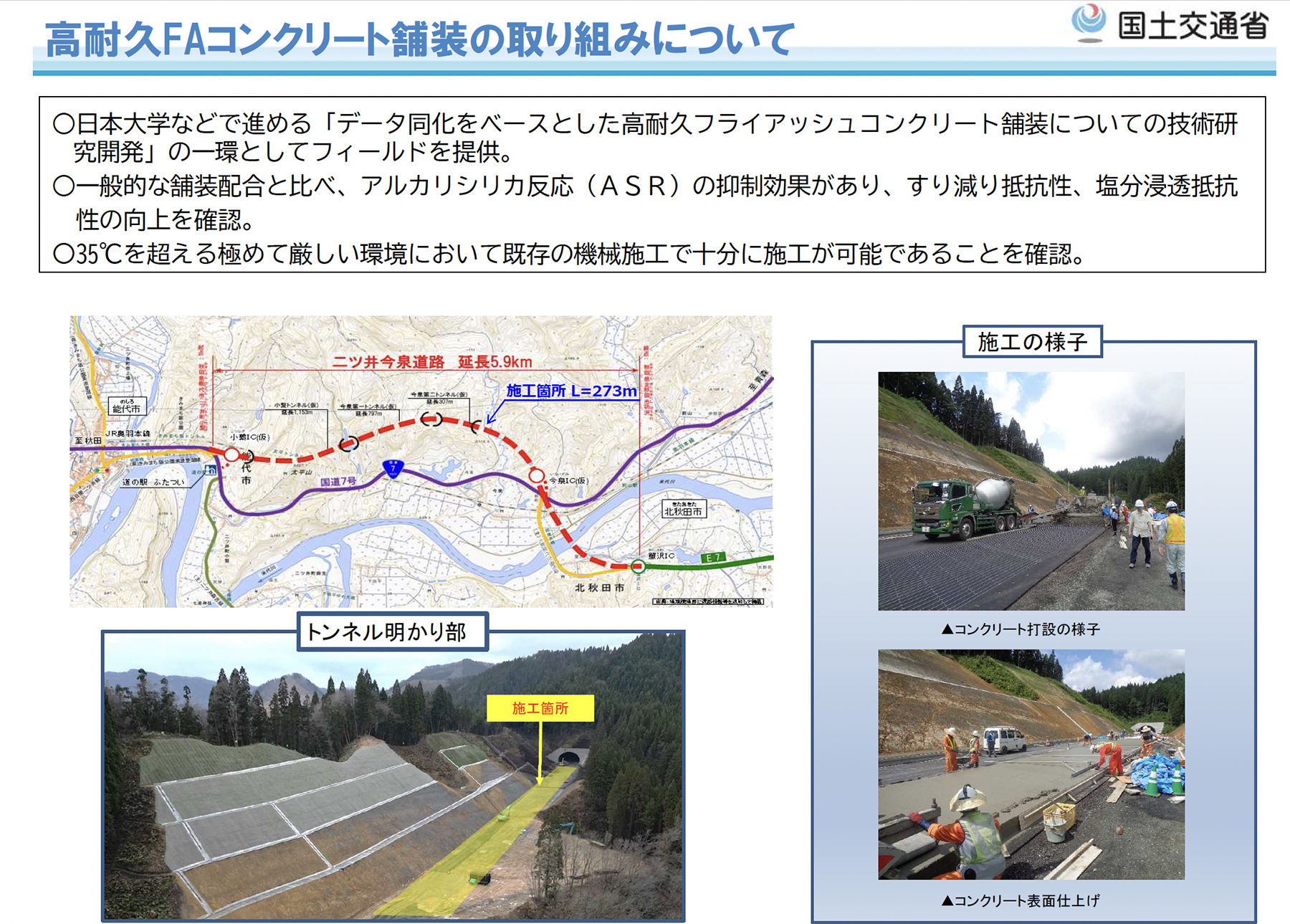 まず、舗装分野では、学識経験者と連携して進めている「データ同化をベースとした高耐久フライアッシュコンクリート舗装の技術研究開発」の一環として、日本海沿岸東北自動車道・二ツ井今泉道路において、フライアッシュを用いた高耐久コンクリート舗装の試験的導入を行っています。フライアッシュを活用することで、ひび割れ抵抗性や耐久性の向上が期待されており、寒冷地特有の凍害対策としても有効と考えられます。