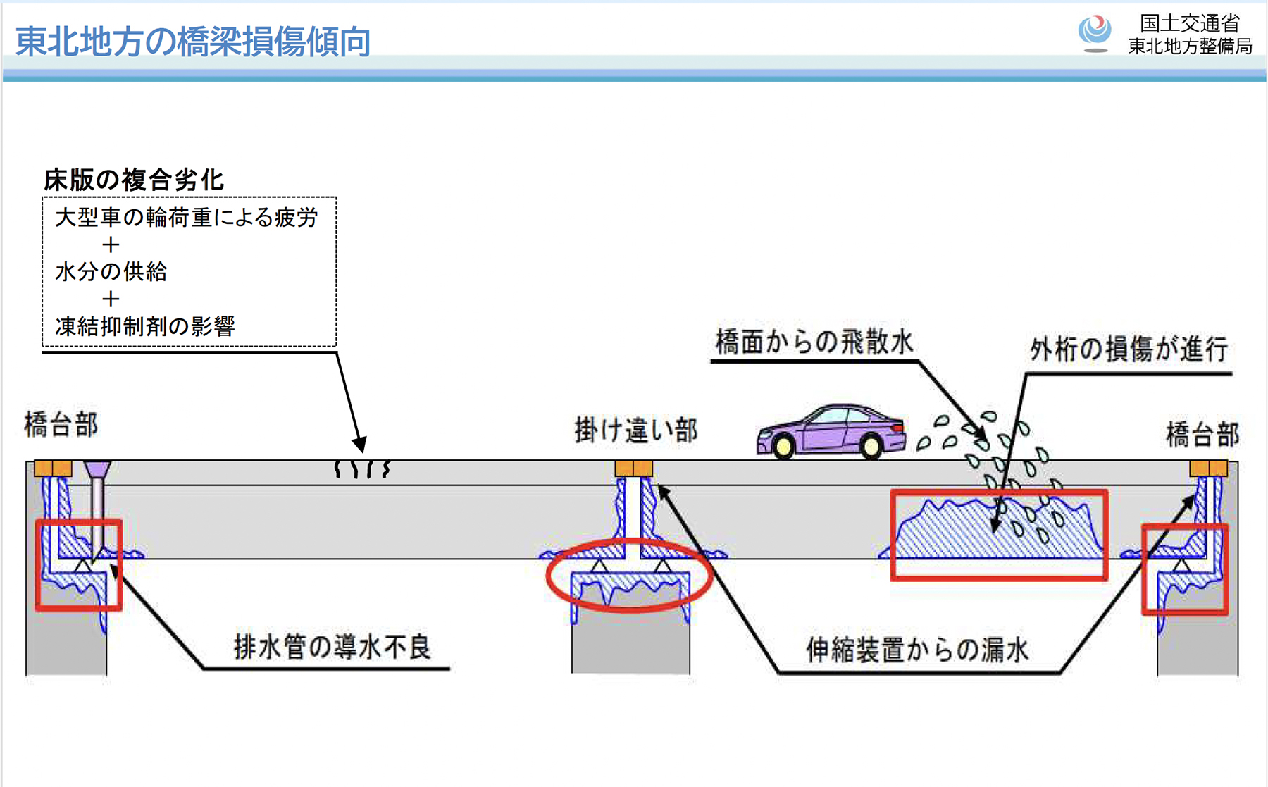 伸縮装置の遊間への土砂の堆積や冬期の積雪が車両通行によって押し込まれることで損傷する例が多く見られます。非排水構造を採用していても、止水材・排水樋が本来の機能を果たさなくなるケースが確認されています。