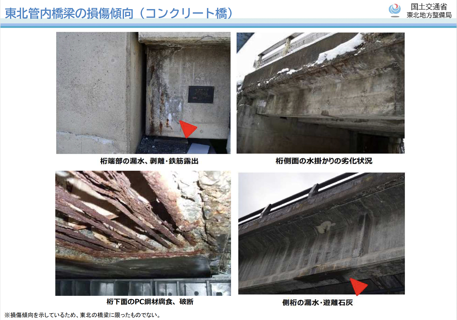 コンクリート橋(PC・RC)では、同じく主桁端部で内部鋼材の腐食膨張に伴うコンクリートの剥離や鉄筋露出が生じています。これも鋼橋と同様に、伸縮装置の非排水機能劣化によって路面水が侵入することが原因として挙げられます。