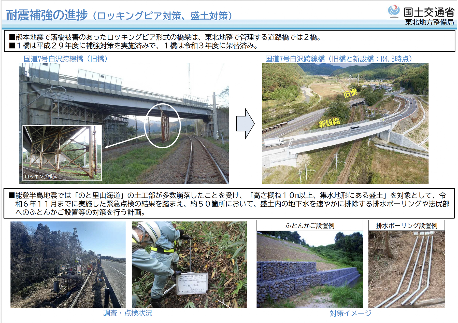 まず、熊本地震で落橋したロッキングピア形式の橋梁については、東北地方整備局管内でも2橋が該当していましたが、いずれも対策済みです。1橋は平成29年度に補強を実施、もう1橋は令和3年度に架け替えを完了しています。