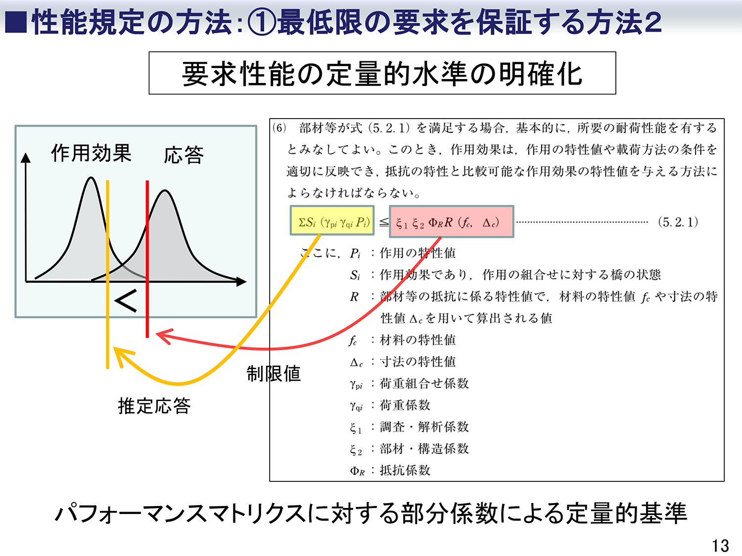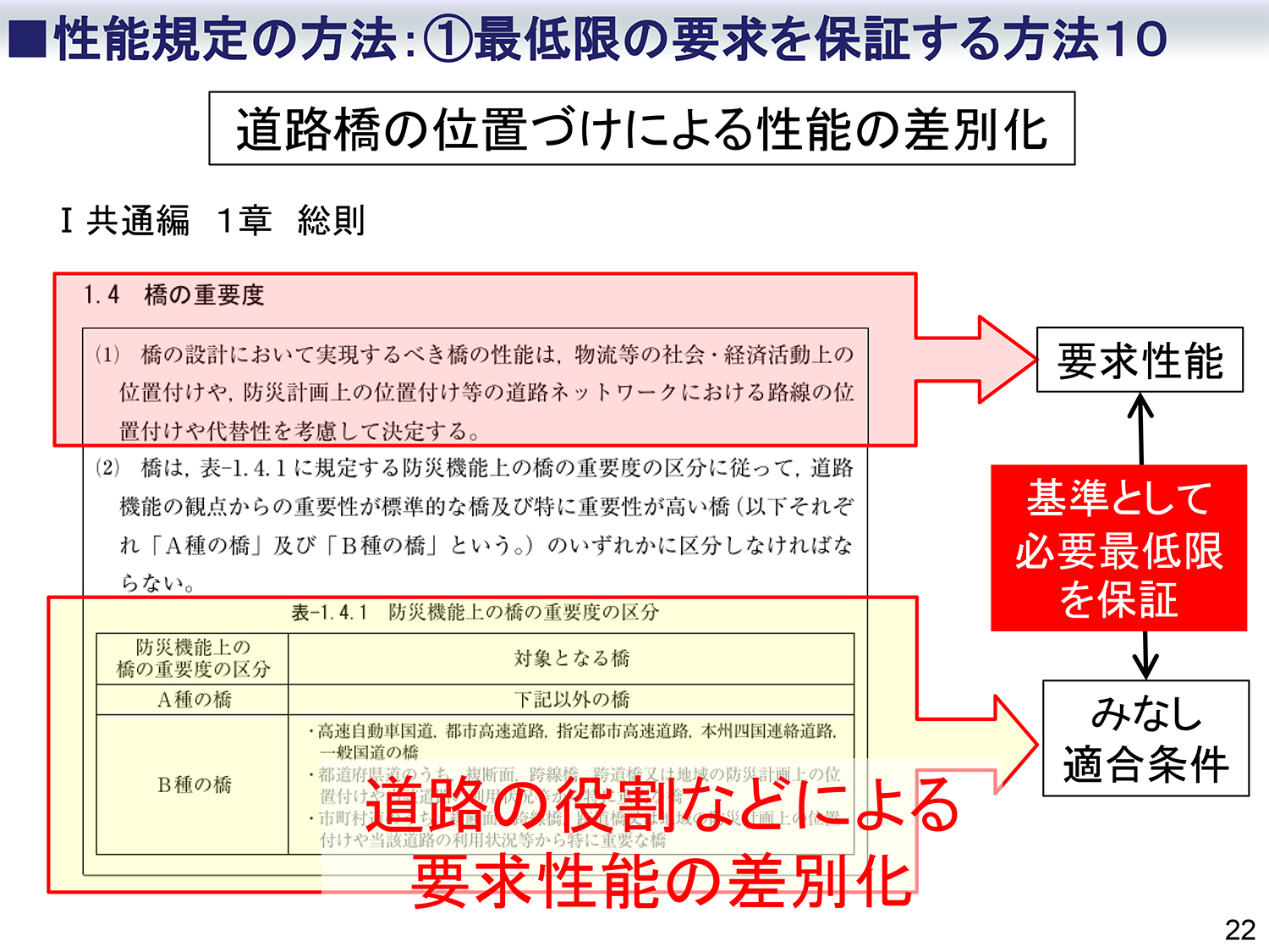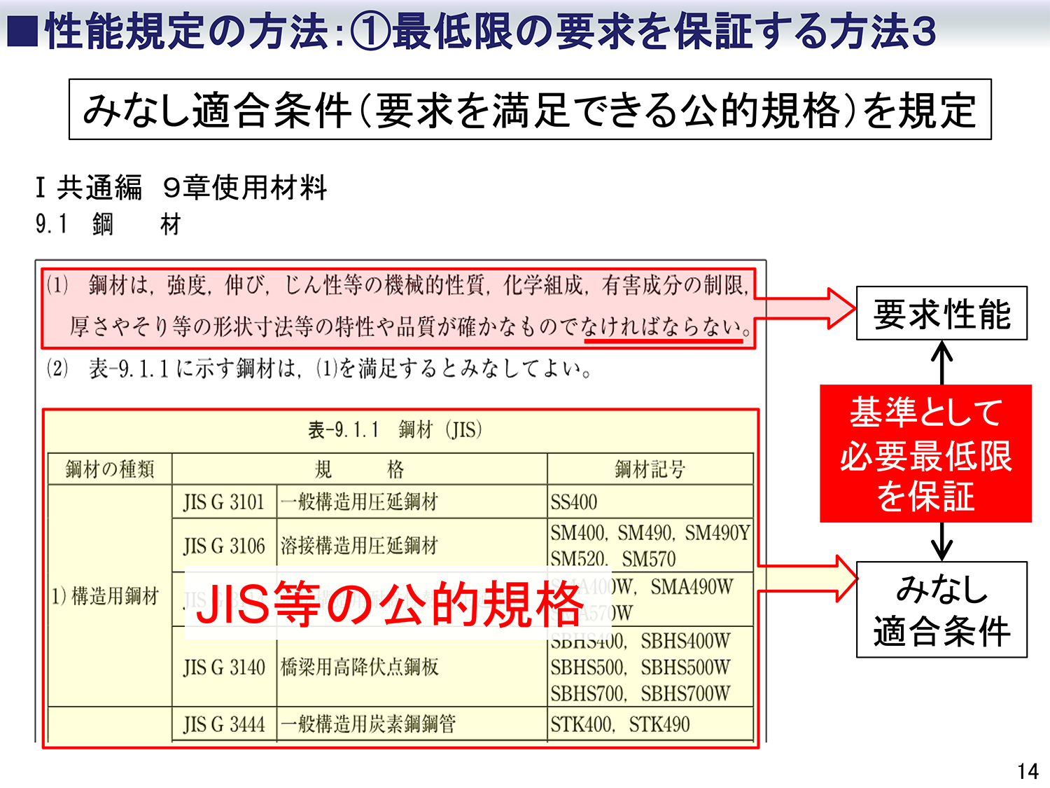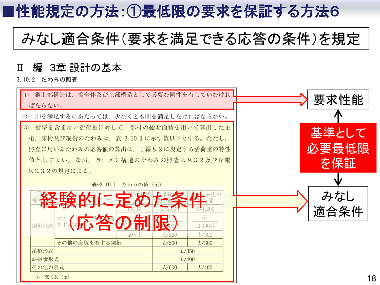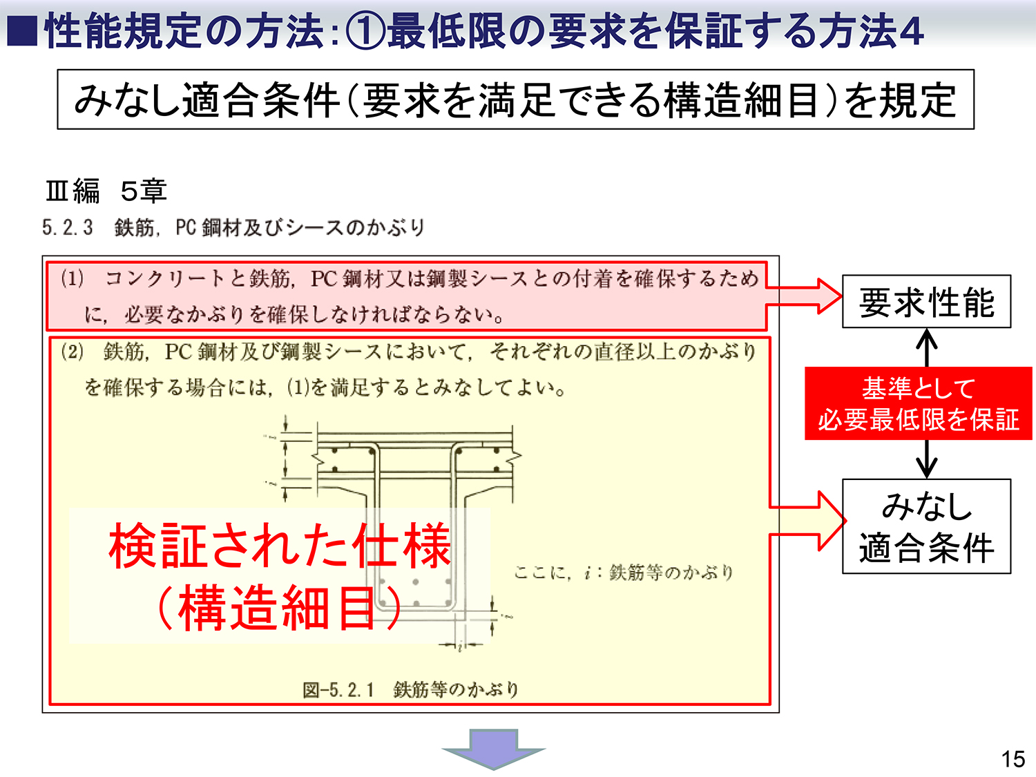 平成14年に初めて性能規定型の考え方をとりいれた基準になりましたが、当初は、従来規定されていた仕様や照査基準の目的や意図を性能と位置付けて条文化しつつも、当然それだけではインフラの技術基準として最低限を明確にできていませんから、それまで規定されていた仕様や照査基準もそのまま、要求を満足できる方法の一つという位置づけで残すということが行われました。