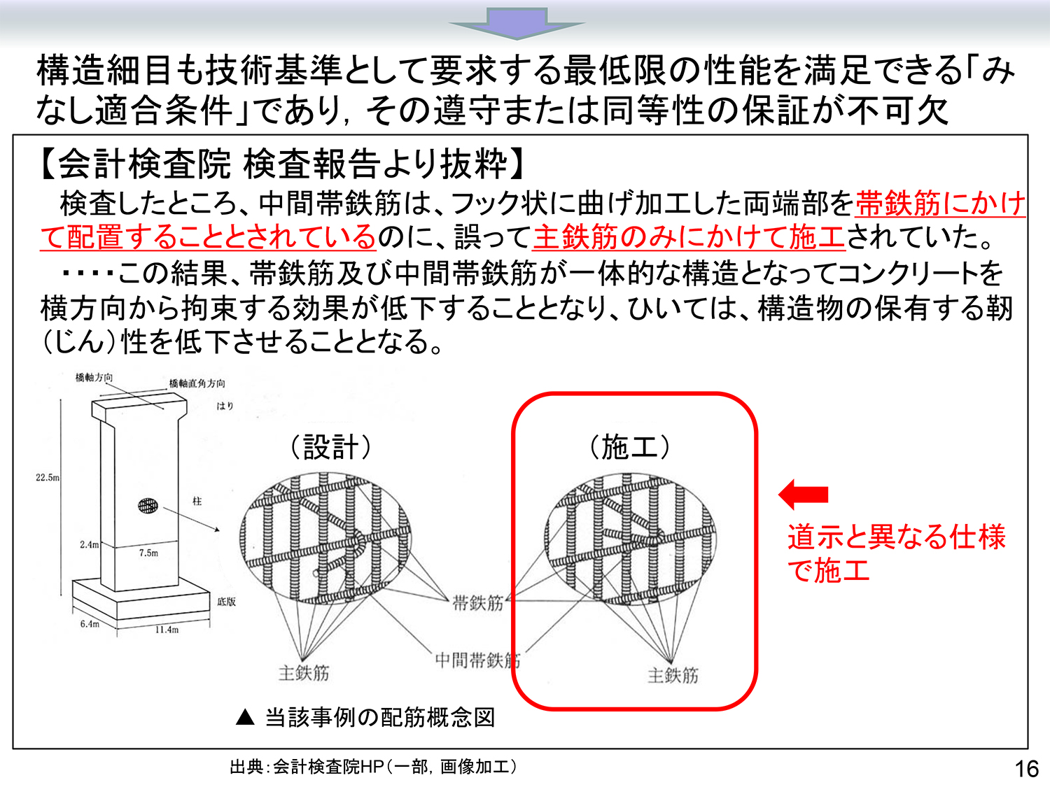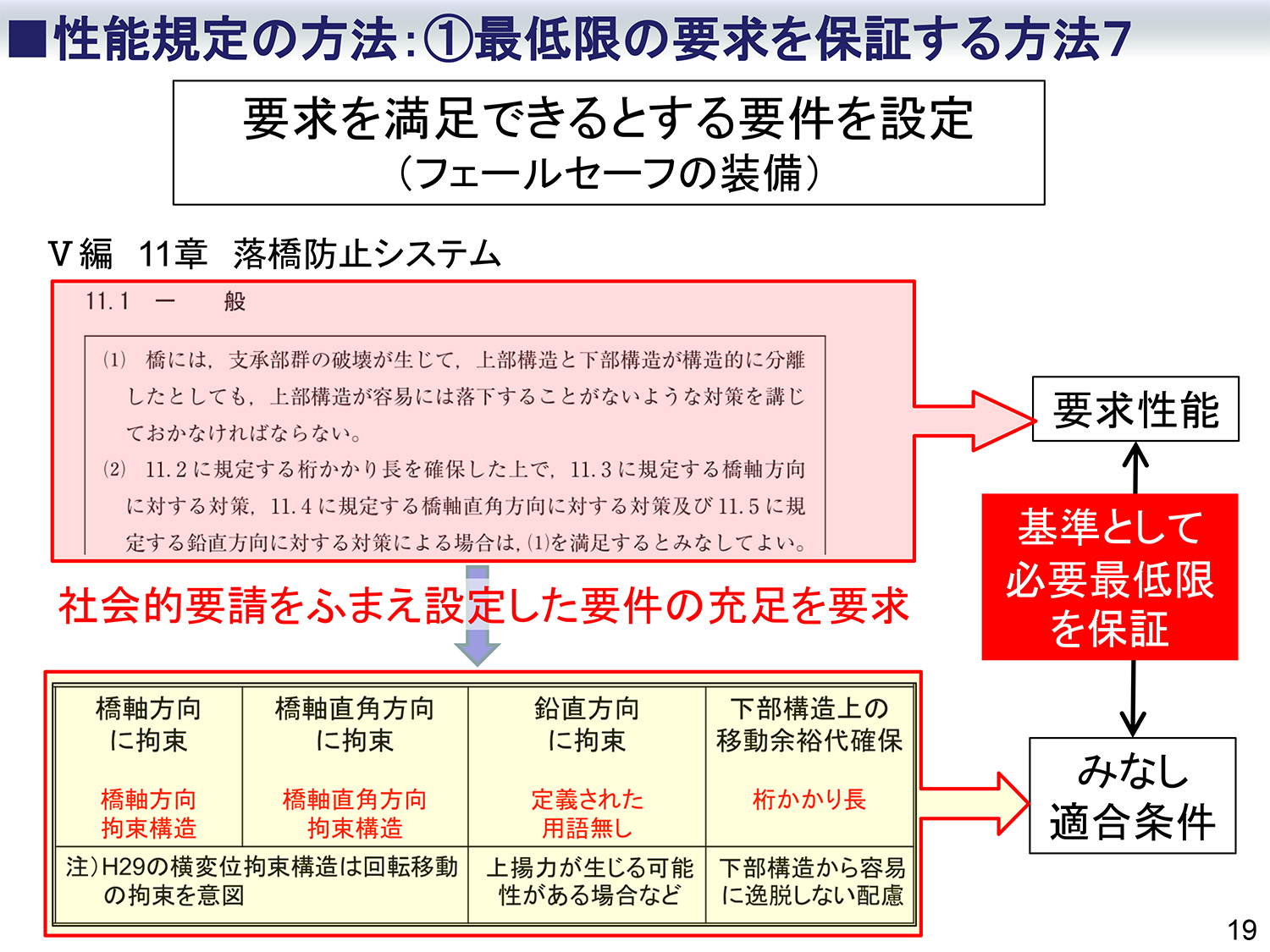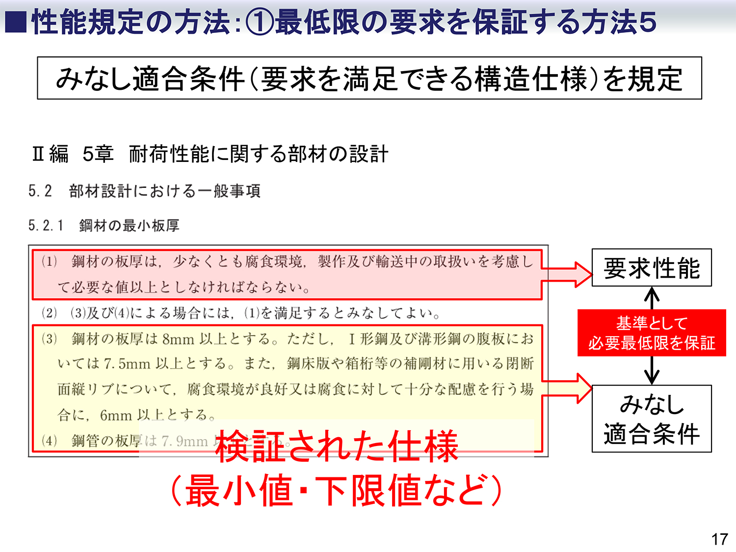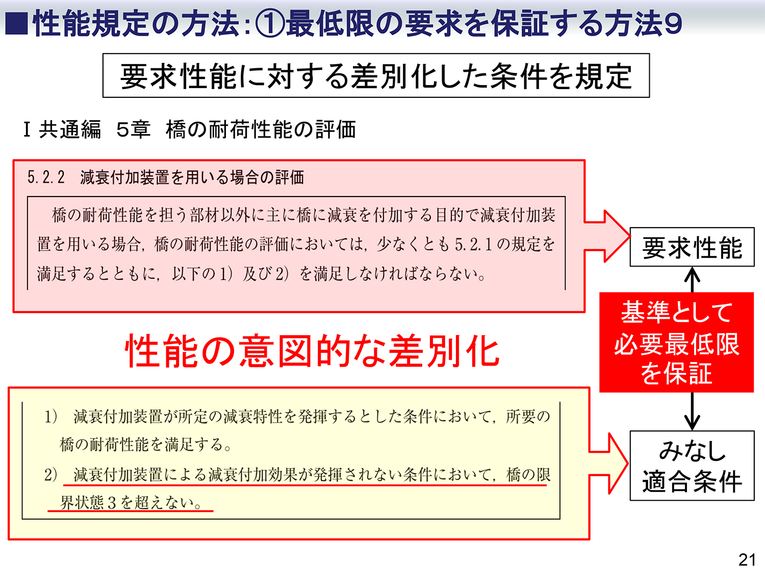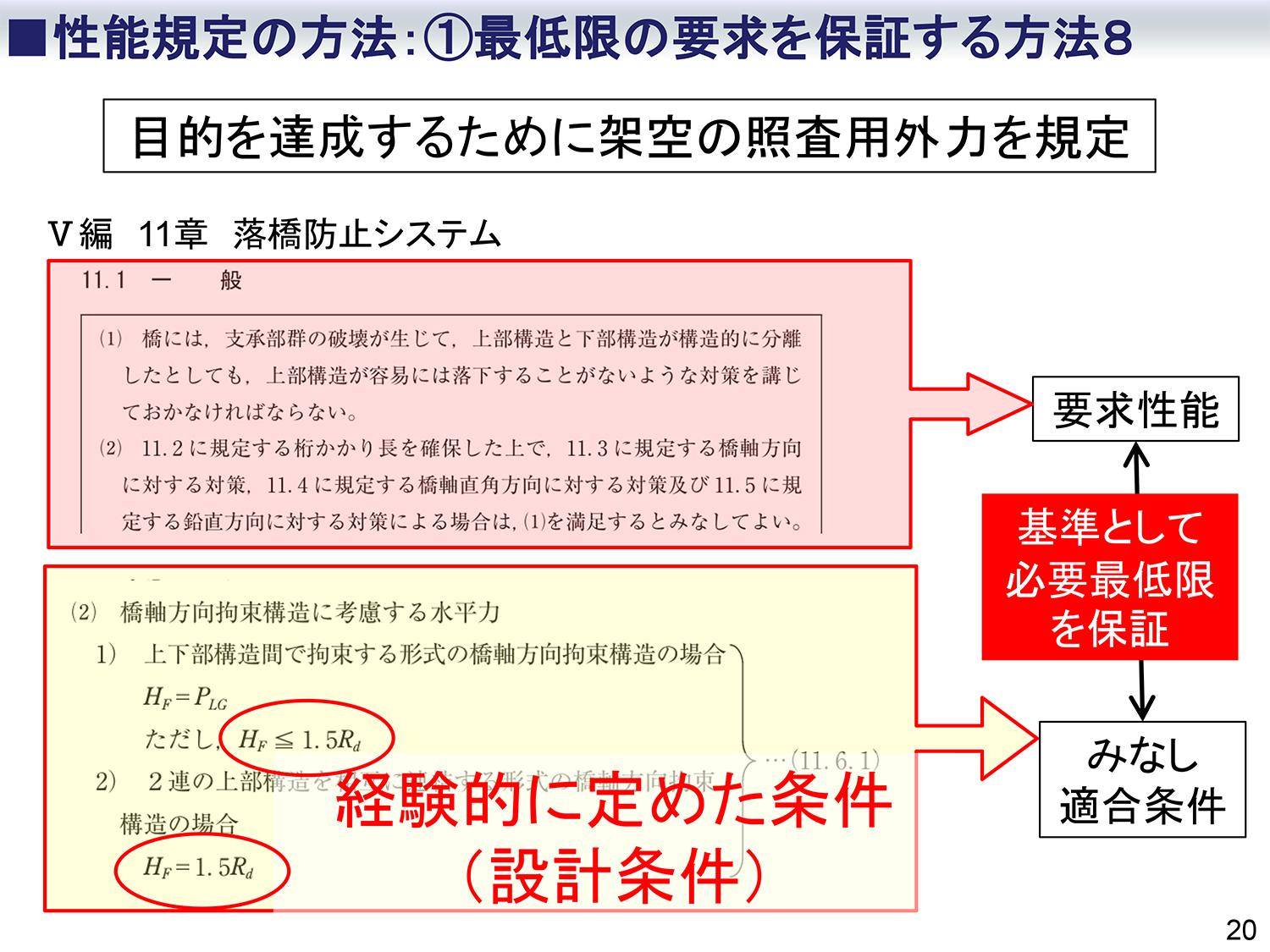 平成14年に初めて性能規定型の考え方をとりいれた基準になりましたが、当初は、従来規定されていた仕様や照査基準の目的や意図を性能と位置付けて条文化しつつも、当然それだけではインフラの技術基準として最低限を明確にできていませんから、それまで規定されていた仕様や照査基準もそのまま、要求を満足できる方法の一つという位置づけで残すということが行われました。