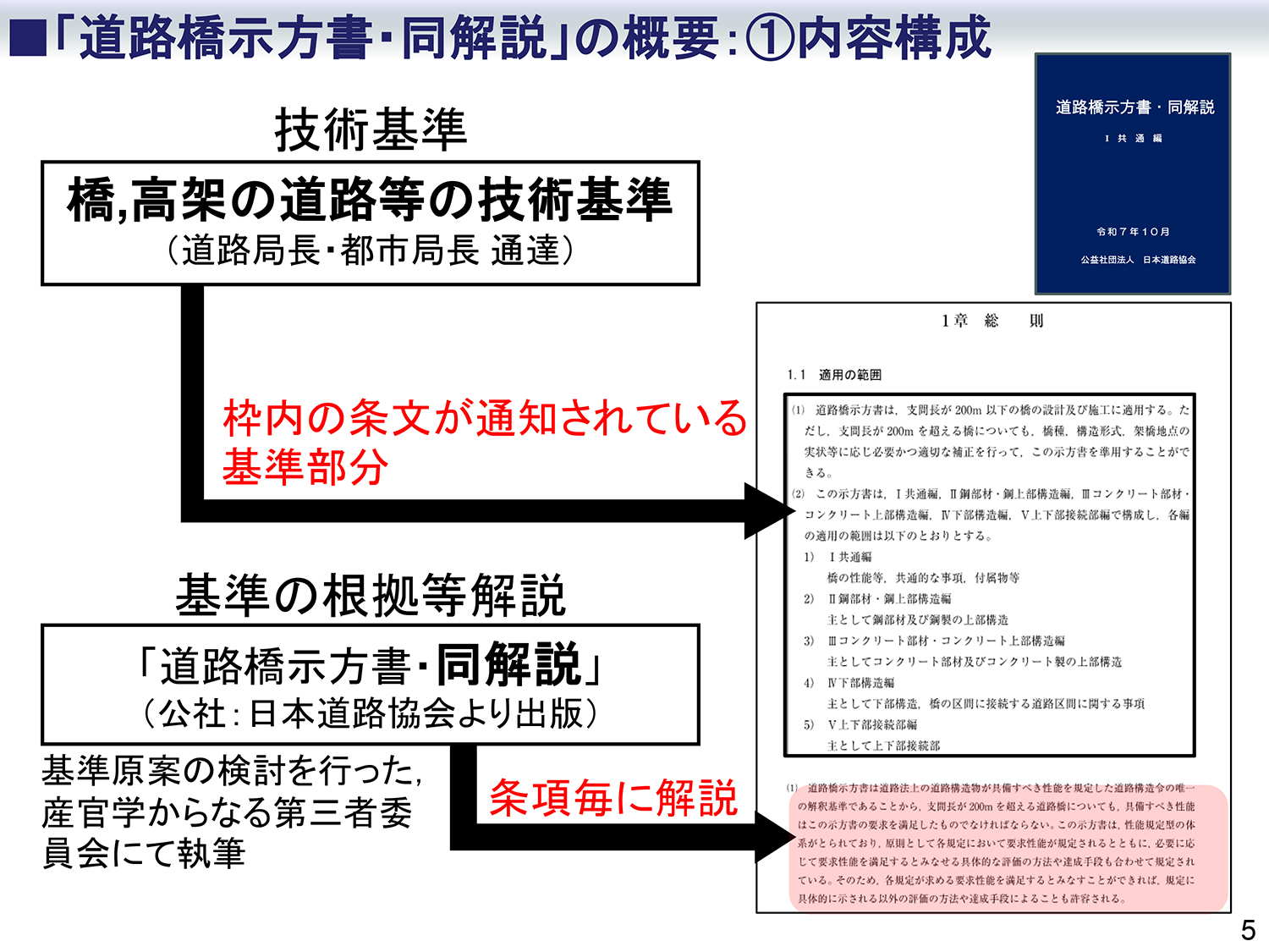 玉越 道路橋示方書は5編構成になっています。Ⅰ共通編、Ⅱ鋼部材・鋼上部構造編、Ⅲコンクリート部材・コンクリート上部構造編、Ⅳ下部構造編、Ⅴ上下部接続部編の5つですね。技術基準としての道路橋示方書は全編で一つの基準ですから、他の法令などと同様にすべての条文が一体不可分で相互に関係性がある一式の規定体系になっています。そのため、基本的に全編の規定が同時に適用され、その全てを矛盾なく満足させることが求められます。