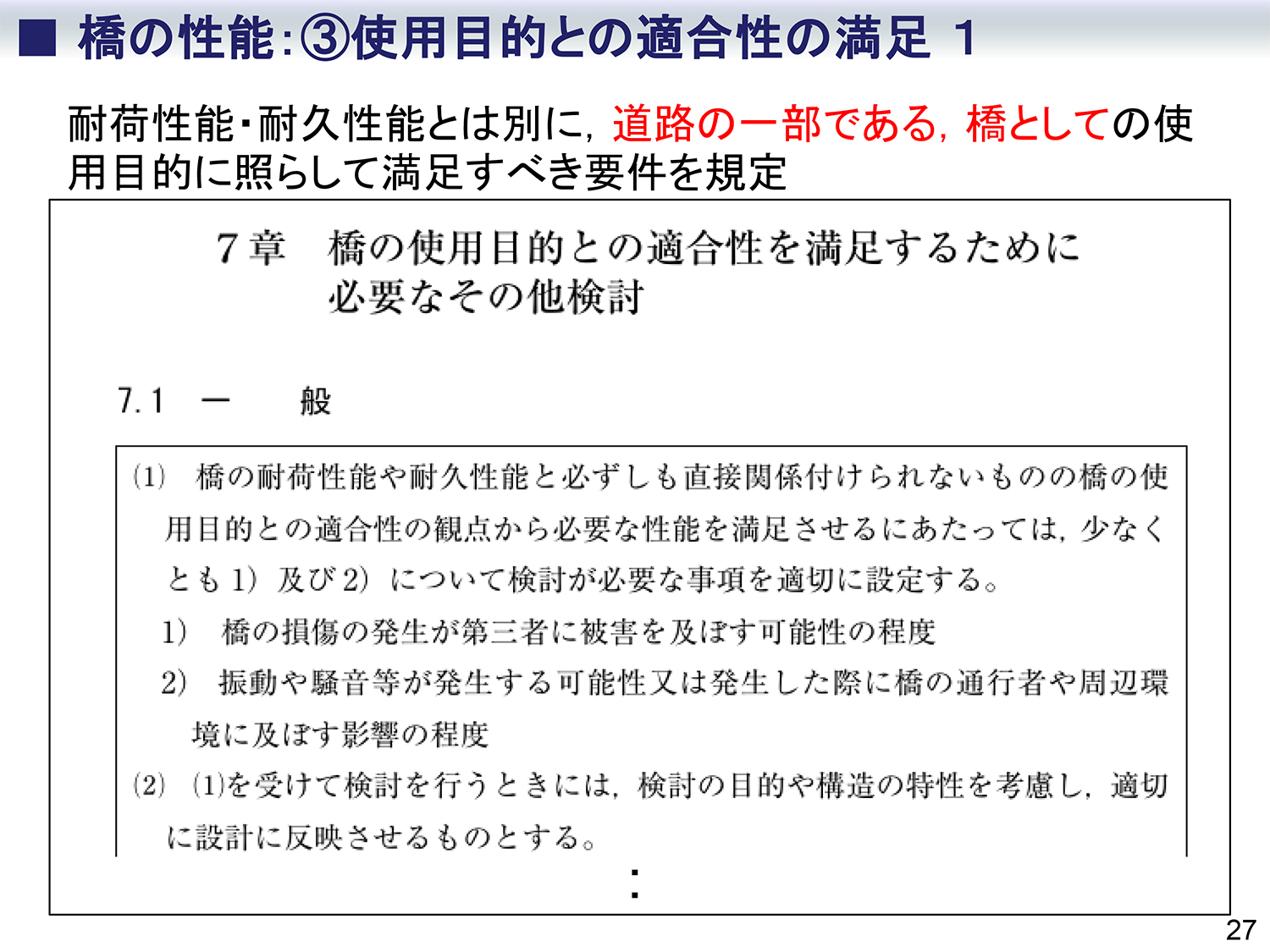 道路橋示方書は要求性能を規定する性格の設計基準であり設計マニュアルではありません。設計実務に使いやすいかどうかはもちろん重要ですが、性能規定型の基準体系として、矛盾や過不足がなく要求されている性能が明確の形で構成されていることも重要だと思います。