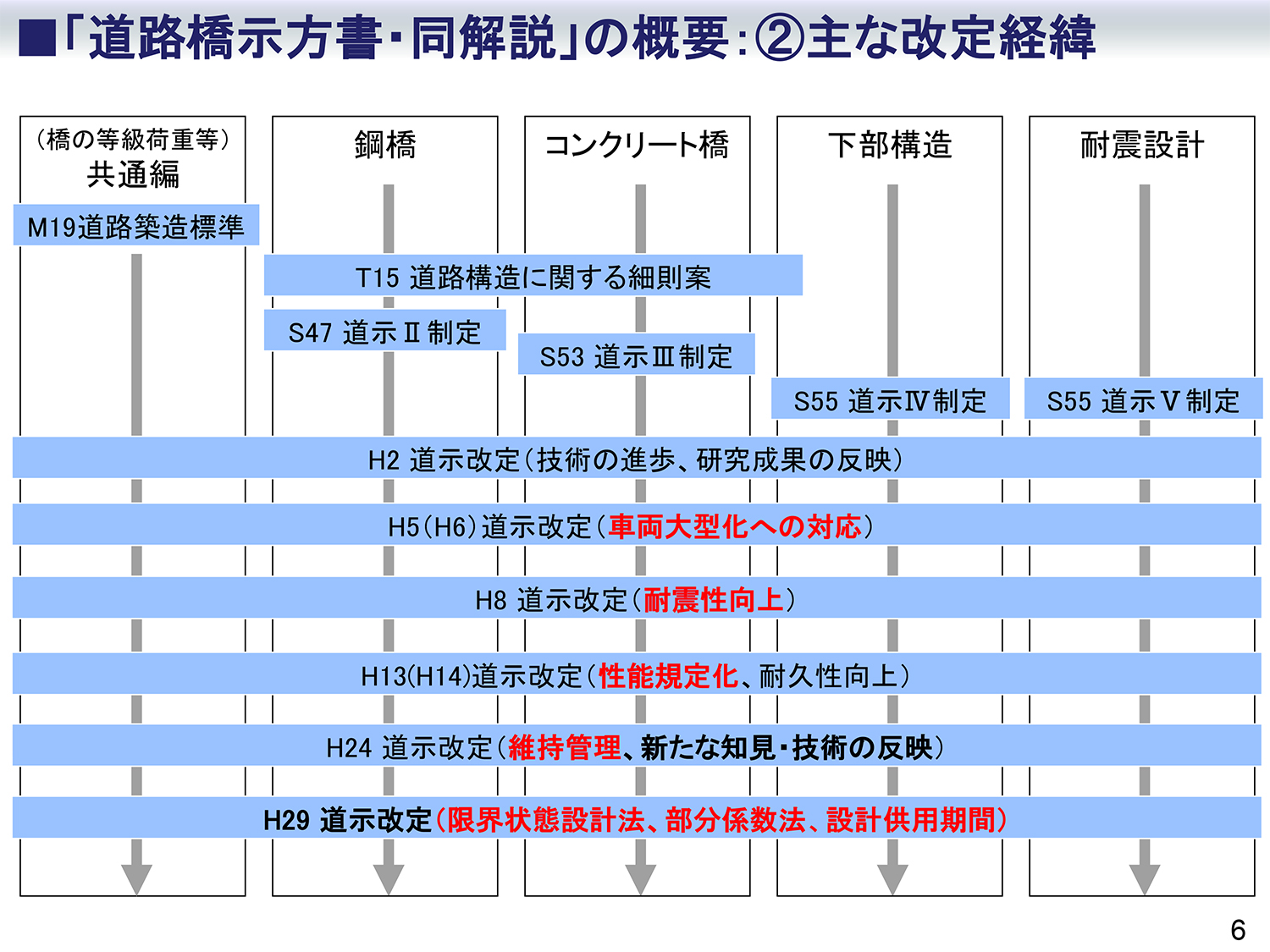 道路橋示方書改定の内容構成と改定経緯(国総研提供、以下同)