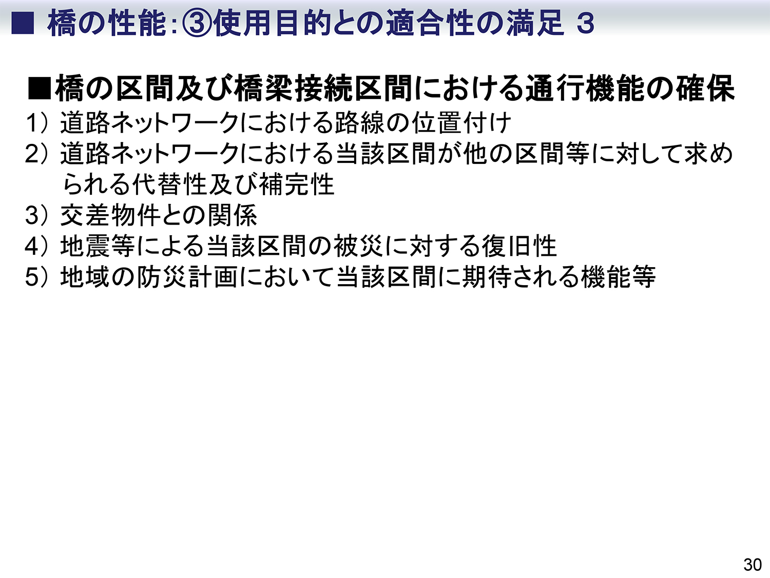 発注者と設計者は個別条件に適合させつつも、そのピンポイントを狙わなければいけないんです。それを実現するという観点からは、創意工夫も許容しながら確実に必要な性能のある橋を実現するための基準としての性能規定化が、今回ようやく概成したと捉えています。要求性能を規定で明確にして、最低限の性能がきちんと担保されなければならないという基準に求められる要件に照らして完成度を高めたというのが今回の改定です。